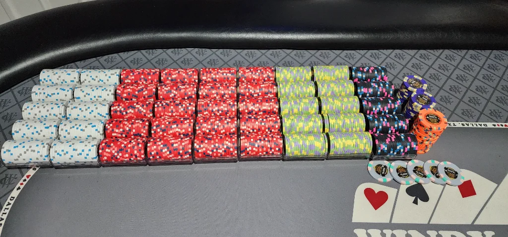 This set was built from over 3,000 chips and culled to the sharpest chips you'll find with an IG set. There are several Grand Opening chips included with the $5's as I thought this gave the set character. I do not have the total number, if this is important to you, ask and I shall count them.