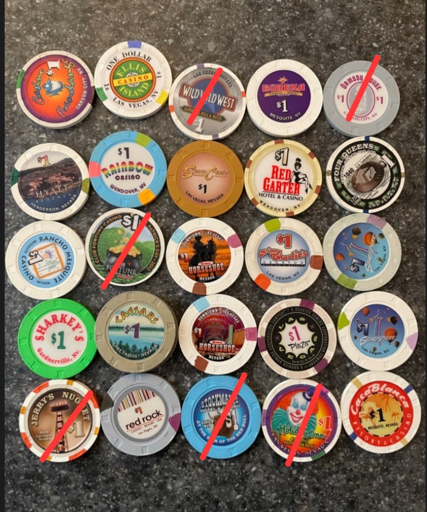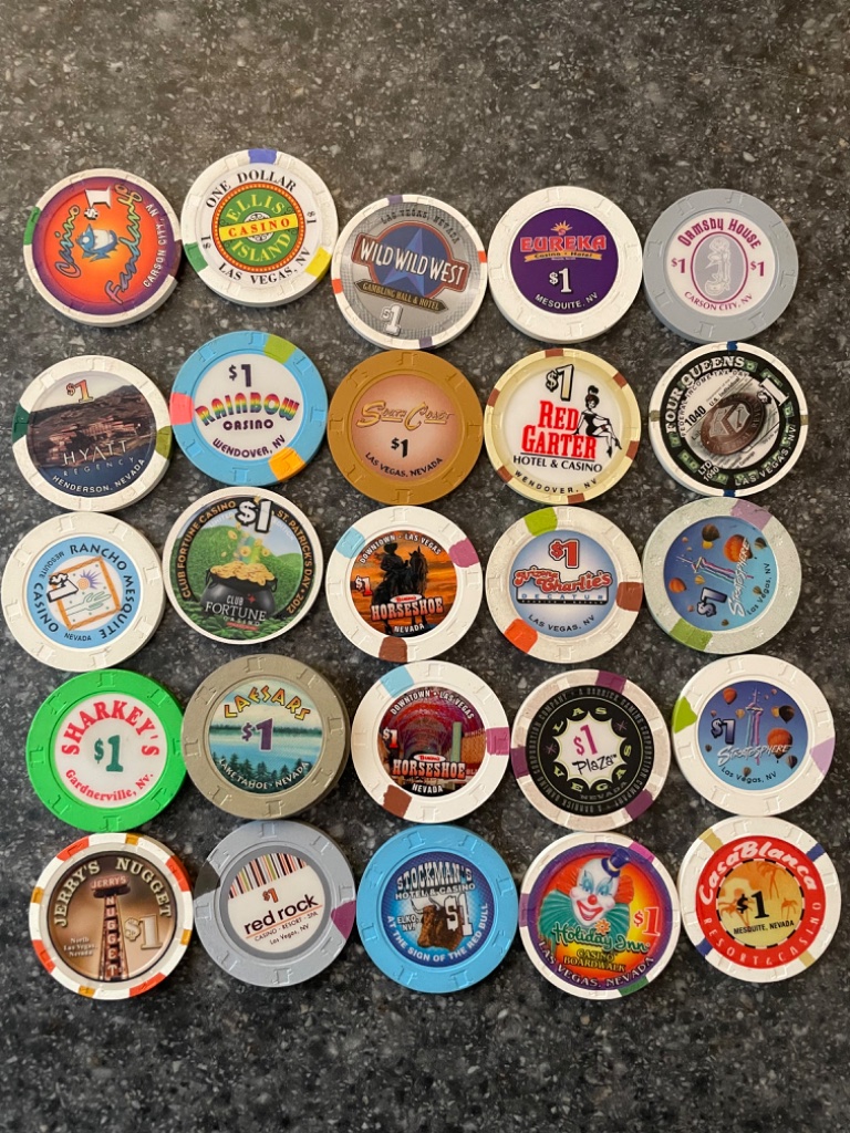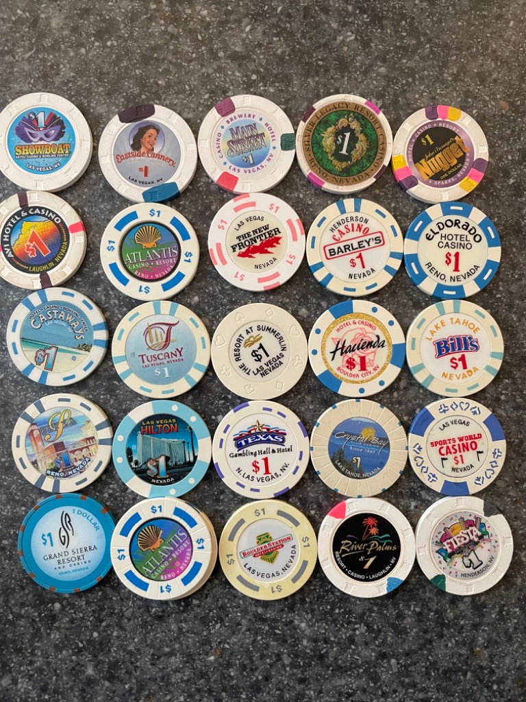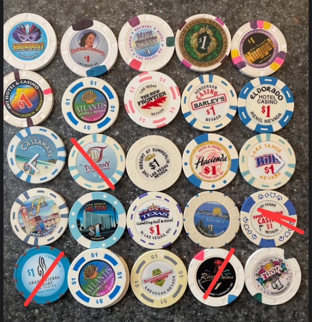 I'm trying to get 10-20 chips (not necessarily all from the same source/casino) for each major manufacturer, including Paulson, Matsui, Bud Jones, etc... If I can get 10-20 $1 chips of a given chip manufacturer from a mix of casinos that's OK as they should be from the same factory with the same manufacturing technique. I got a barrel of Majestic Star leaded Paulsons from Apache which are great, but I'm hoping to put together a barrel of newer Paulsons from their Mexico plant (if I understand the trajectory of Paulson correctly, having been acquired then acquired again, but still having a large manufacturing base in Mexico producing chips like the Tiger Palace as well as contemporary casino chips).