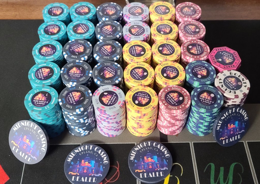 I can take some nicer photos with my Nikon. These were just some quick snaps with poor lighting on my cell.I only rent a room in Upland, and have only two lights in said room (needless to say I do not have room for a poker table), so I'm borrowing a couple of well-taken shots from my buddy @sheikh617 to officially register the Midnight Casino chips for ceramic hybrid and chip set of the year. I think you'll like how well these came out.