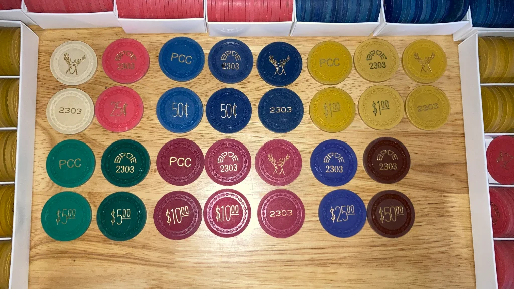 This consists of three different sets that were purchased by the Elks. While the colors aren't identical, blues are all 50c, yellows all $1, greens all $5, reds all $10, so mixing and matching will still make a working set. Please see the photo of the faces for examples.