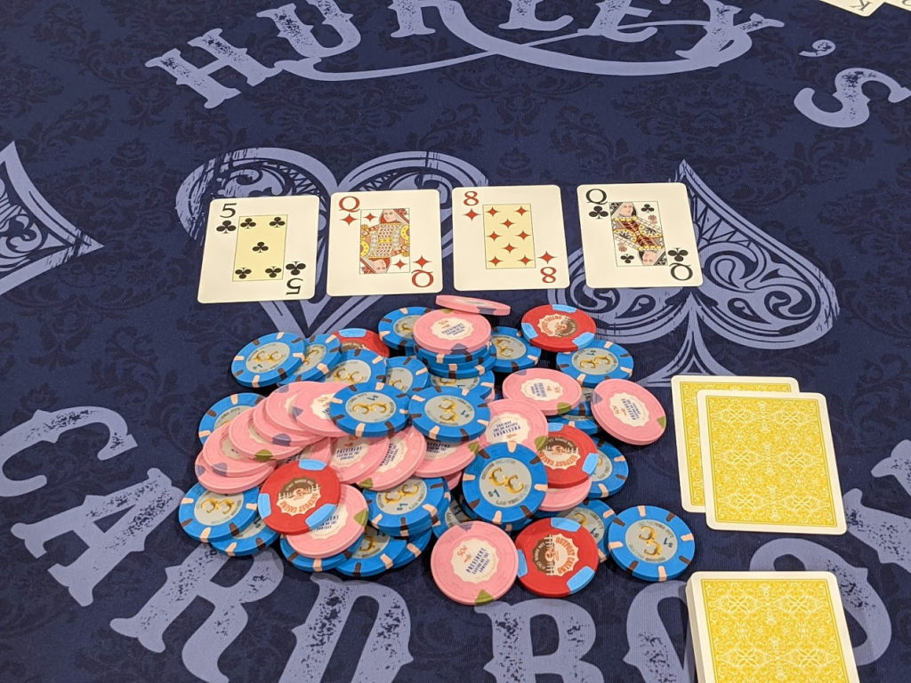 It checks around. @Pippa should know better than to bet his Jiggities in a 10-handed board that's got an over and a flush draw; Half the people probably have an over and someone's gotta have a Queen, right? Well, he bets it anyway! $2.50 to rep a Queen. |