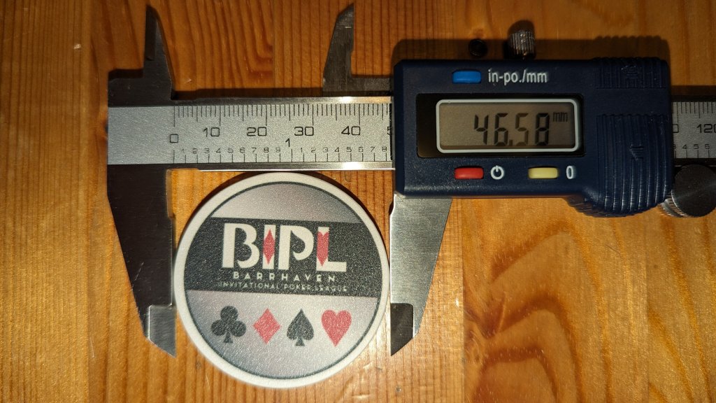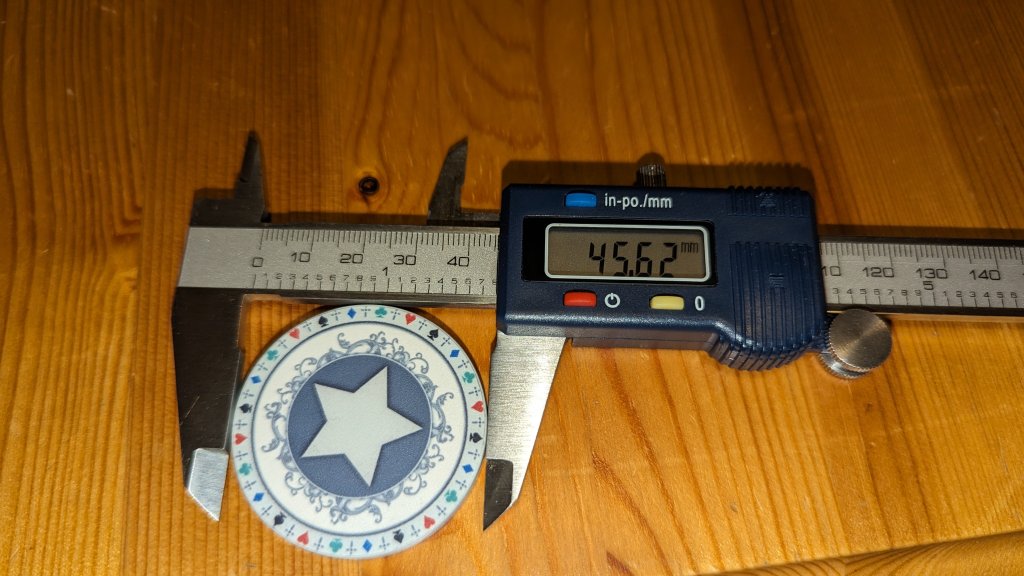 The Old West seating chips were 46mm and were thicker than BR Pro Poker's current offerings. To my knowledge, those blanks are not available for use. Which is too bad, as I would have gladly used them if they were an option for the seating chips I had made for our league (I used the BR Pro Poker 47mm chips). I've included pictures of the measurements for both.