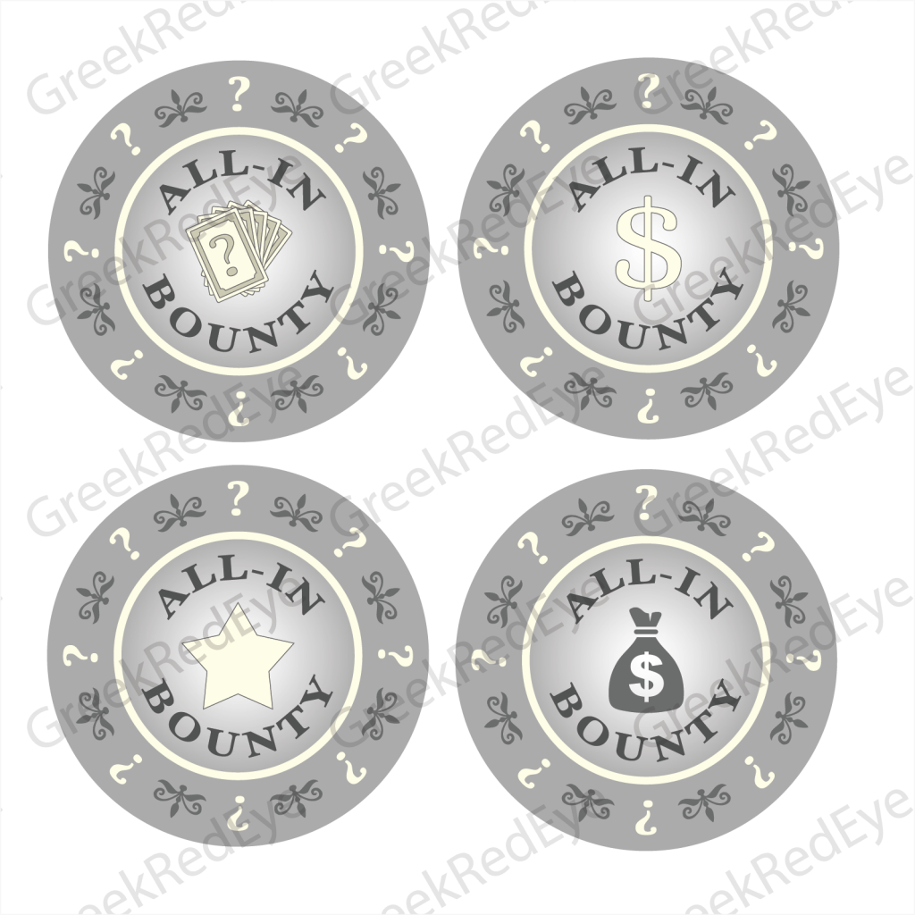 My one question is on the Bounty/All-In side .... will there be options for which one we want or are you going to settle on one design for all? If I had to rank them I think I would go with (favorite - least favorite): Moneybag, Cards, Dollar Sign, Question Mark, Star. I like the color for the question marks along the outside rim but as you see them in person you know best what actually looks better. Regardless what you decide I'm in for a set and am eager to get them in my grubby little hands on my poker table. :)