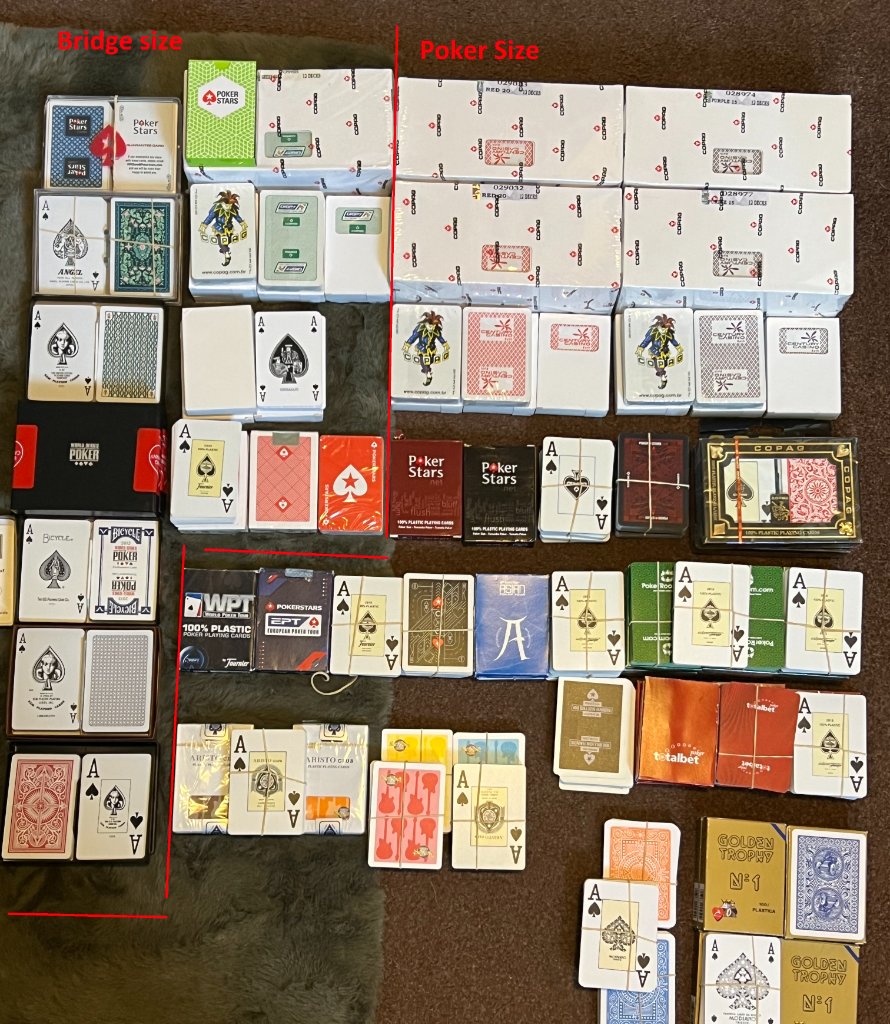 Copag's are the card of choice provided I can pick them up cheap and cheerful and have plentiful supply as can throw in rubbish bin as soon as damaged/grubby/flecked do I like them? More 'meh about them but when I have them for <£2 a deck they make a lot of sense. Copag, Fournier, Modiano, Aristo Club, Grimaud, KEM, Angel pictured. Many will never be felted such as Fournier EPT/WPT, Fournier WSOP and Aristo Clubs that are getting rare. Fournier mostly get felted on more exclusive Saturday night games. KEM's are expensive, over rated garbage in my opinion, which is a shame because they have my favourite Ace of Spades. Modiano I am neither up nor down about they are nice cards but don't wow. Two decks of Angels which I feel are too thin. Always been a fan of Aristo Club since first discovering UK casinos used them but will fleck almost as badly as Copag. Fournier has always been the best in class for me in terms of quality, playability, shuffle, longevity & price. Ran pub poker league and still involved for 15+ years. Never tried Faded Spade as in UK so more restricted to European & Asian markets (especially since Brexit.)