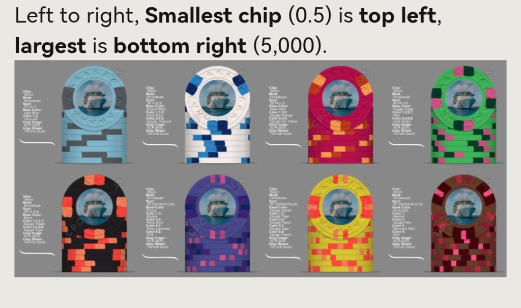 Another thing to consider - you have many denominations. Typically in a tourney you'll only have 3-4 colors in play at anytime. Pretty much the same with a cash game. So, you just need those chips that will be side by side to stand out from each other. Pretty much all your colors really pop against each other when grouped in sets of 3. I like your purple - the dayglo pink jumps off the chip. Had to put my 2c in because I can sit at the chip design tool forever.
