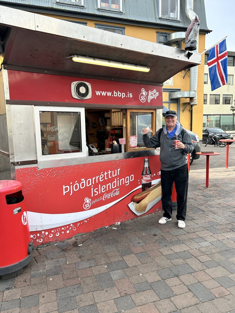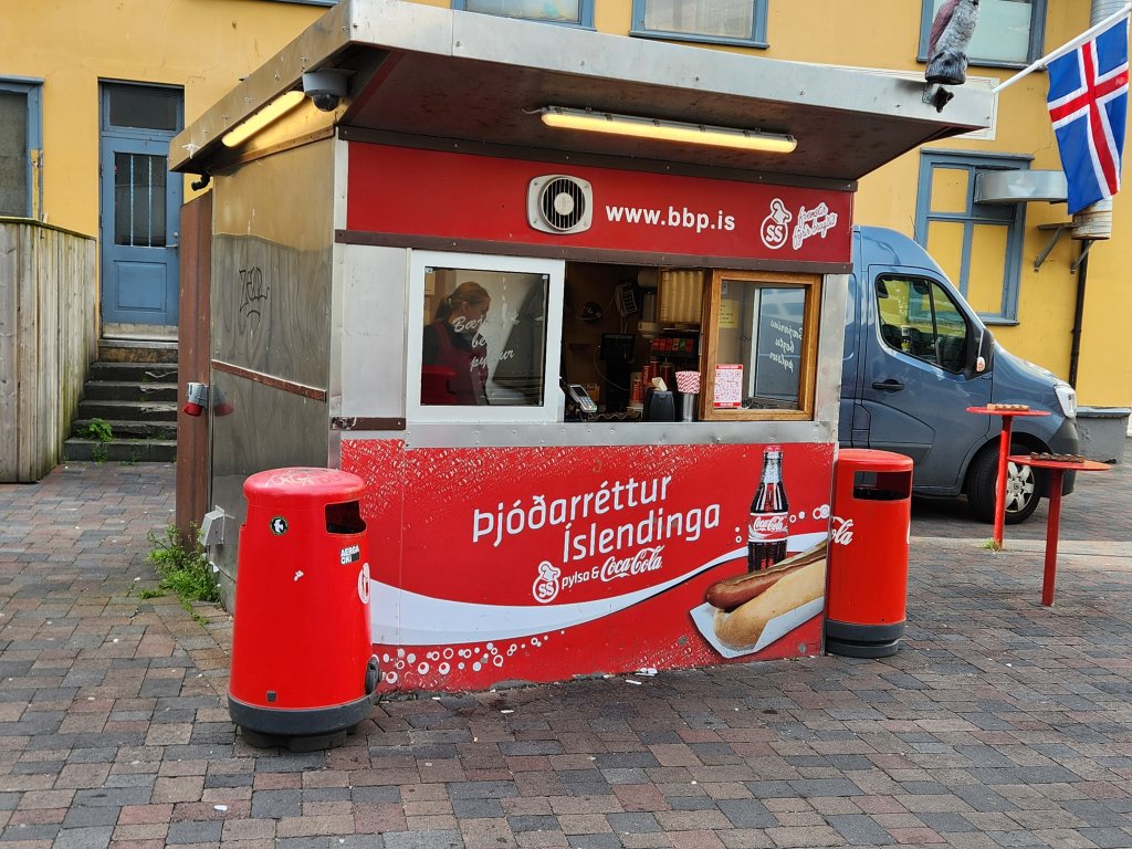 Lamb dog with the works-- icelandic ketchup (sweetened with apples), Icelandic mustard, raw onions, crispy onions and remoulade sauce -- 770 ISK