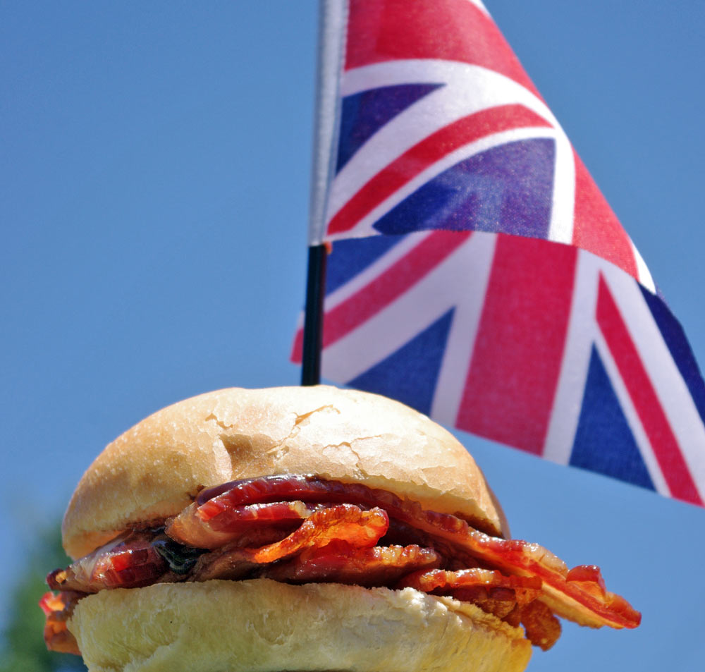 It's a pukka sarnie, made with a buttered bap stuffed with streaky bacon. It's the dog's bollocks, and you'd be chuffed to have one.
