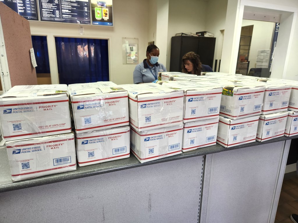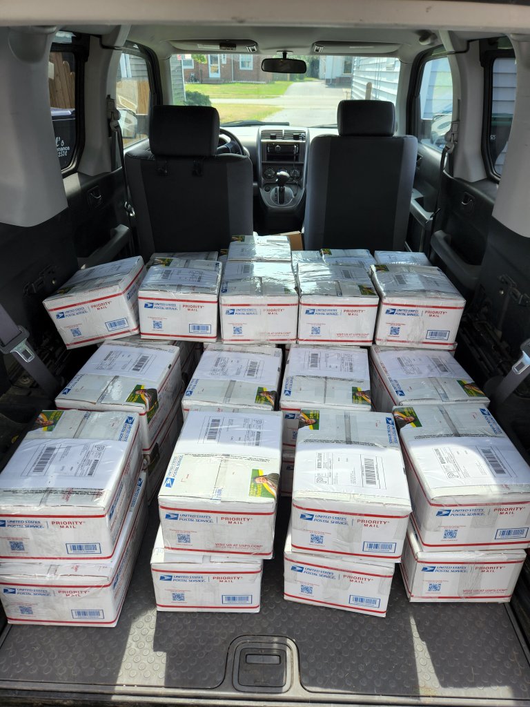 Approximately 35,000 chips, in 25 boxes (100 boxes if you count the 3 little boxes inside each box)....all unpacked, counted and sorted, repacked into 50 boxes for 29 members, labelled and dropped at the post office.....All in about 19 hours.