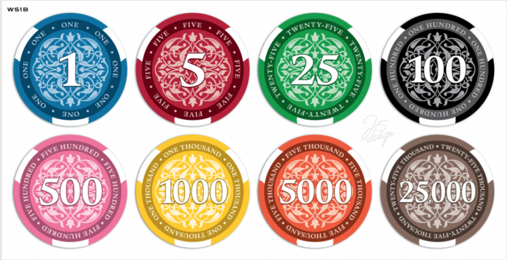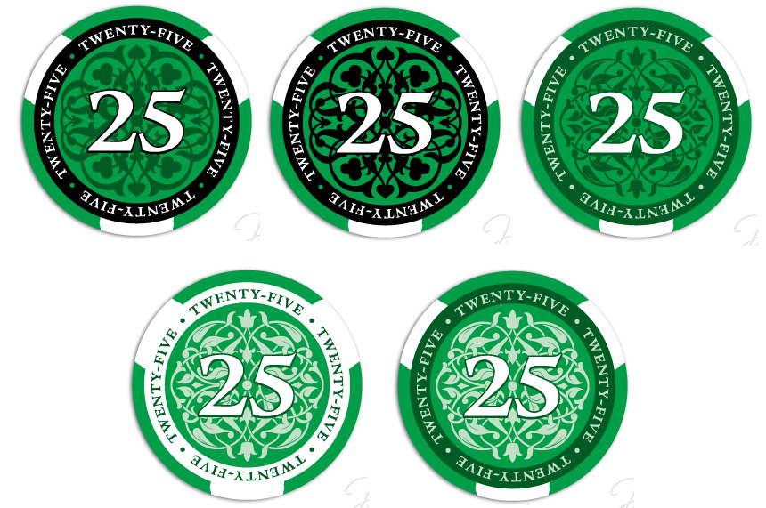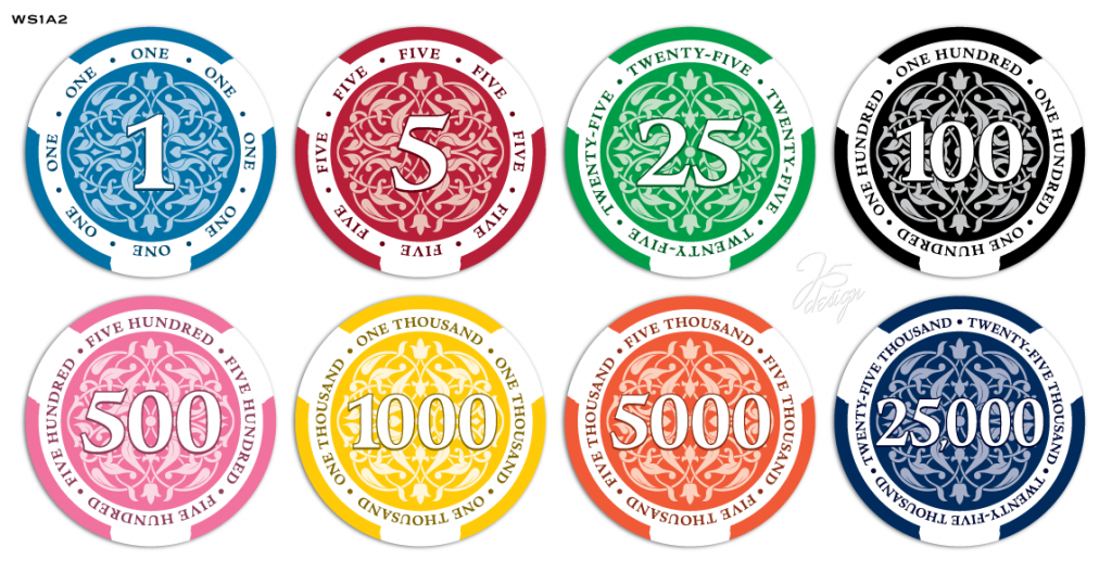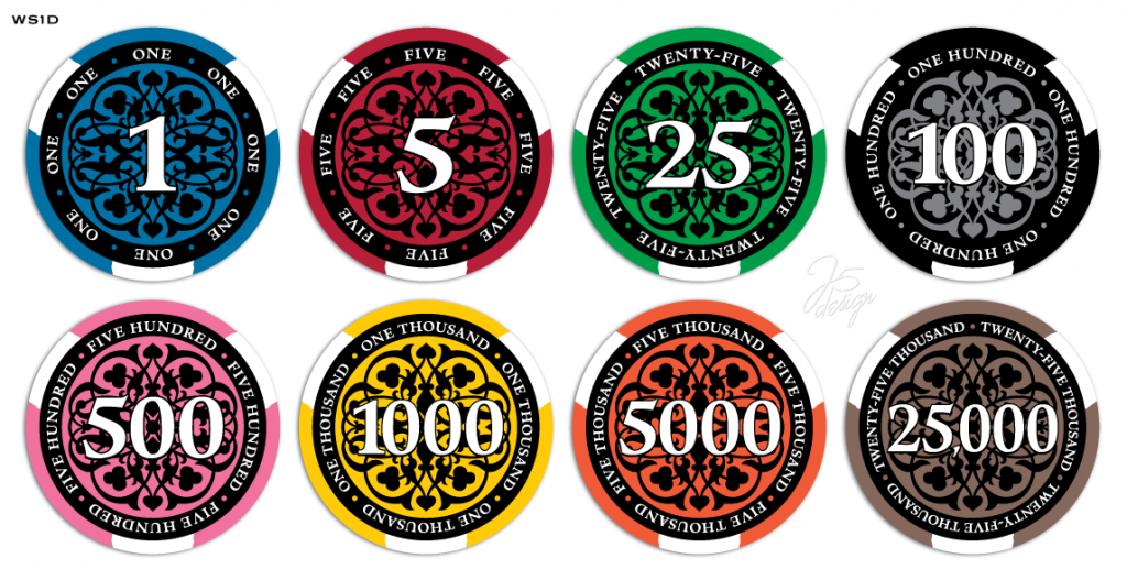 #1: This one is my favorite if it only had the denomination font used in chip #2. If all the chips are color matched it has enough color including the outer ring to make splashed pot recognition good.