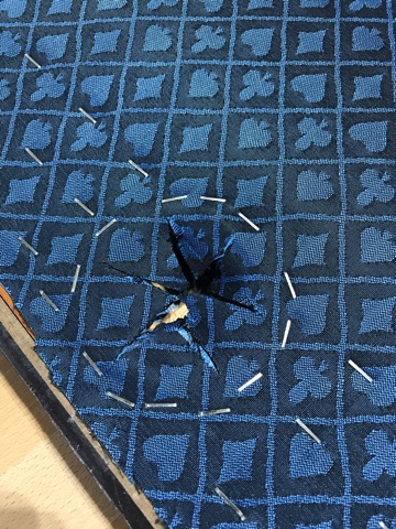 Here is me attempting to line up the cloth (I deemed it "good enough" especially doing this alone)