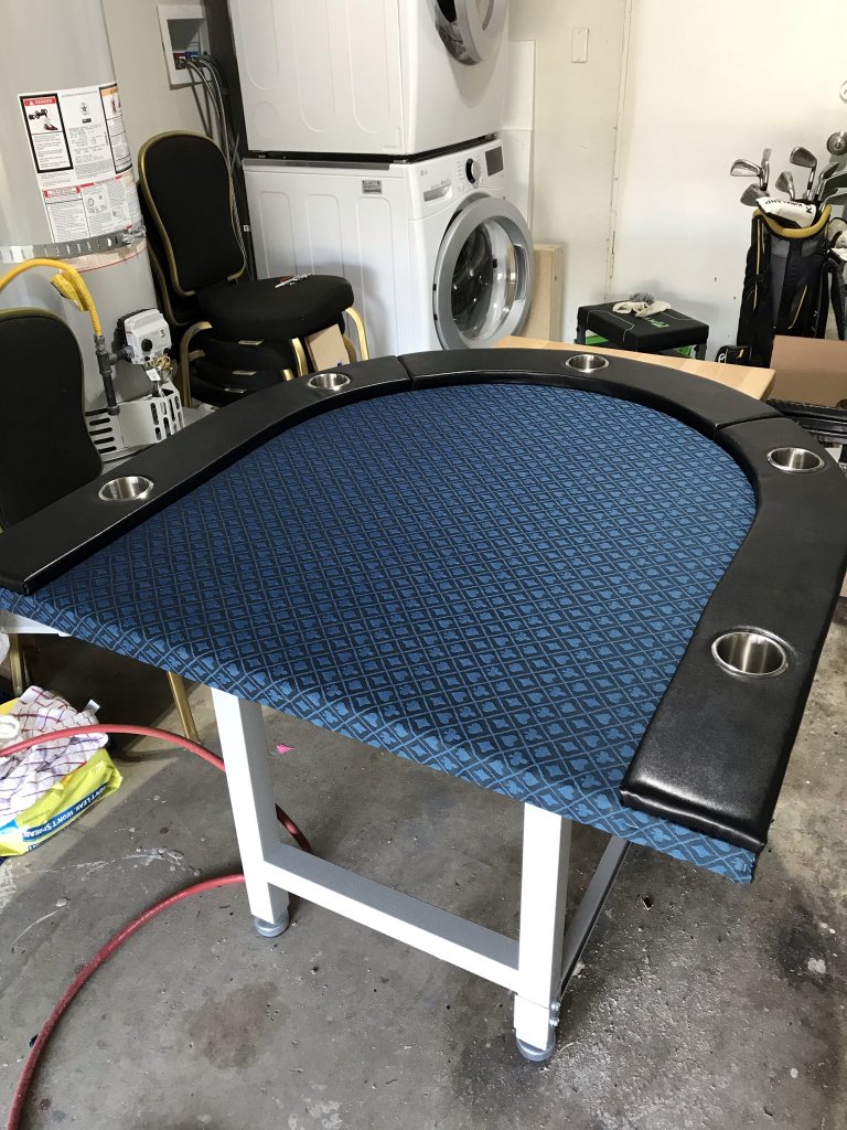 From there, I drilled out the cupholders without having to worry about snagging the cloth. Note that you will only be able to drill out 6 of the cupholders as the other 4 are obstructed by the legs underneath. What I did was drill those 4 about halfway (to make sure I was drilling in the exact correct spot), then finished the job when the legs were removed. If I did this again, I would DEFINITELY buy a better hole saw bit. This thing was cheap and dull, and I nearly started a few fires. Be careful if you have a cheap dull bit like this the friction will cause the wood to smoke.