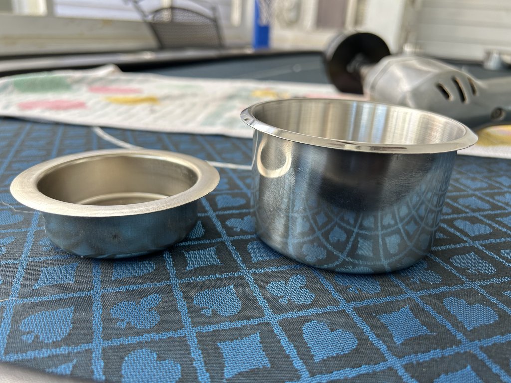 I changed out the cupholders, the new ones are 3.5" wide, and fit full sized yetis (see picture). I drilled a pilot hole for the hole saw arbor by measuring the middle of the old cup holder holes, and then drilled with a harbor freight hole saw from underneath so that I wouldn't mess up the padding/cloth on top. It was really straight forward. I sanded the holes after they were cut until the cupholders fit perfectly! haven't even glued them in and I'm not sure that I need to. I did have to cut the leg frame for the 4 cupholders nearest to them.