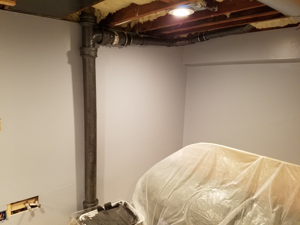 And I finished up last night by painting the main drain pipe and the lally columns, I went with this neat "hammered" black paint, they came out looking pretty cool. I may end up painting all the HVAC duct work with this.