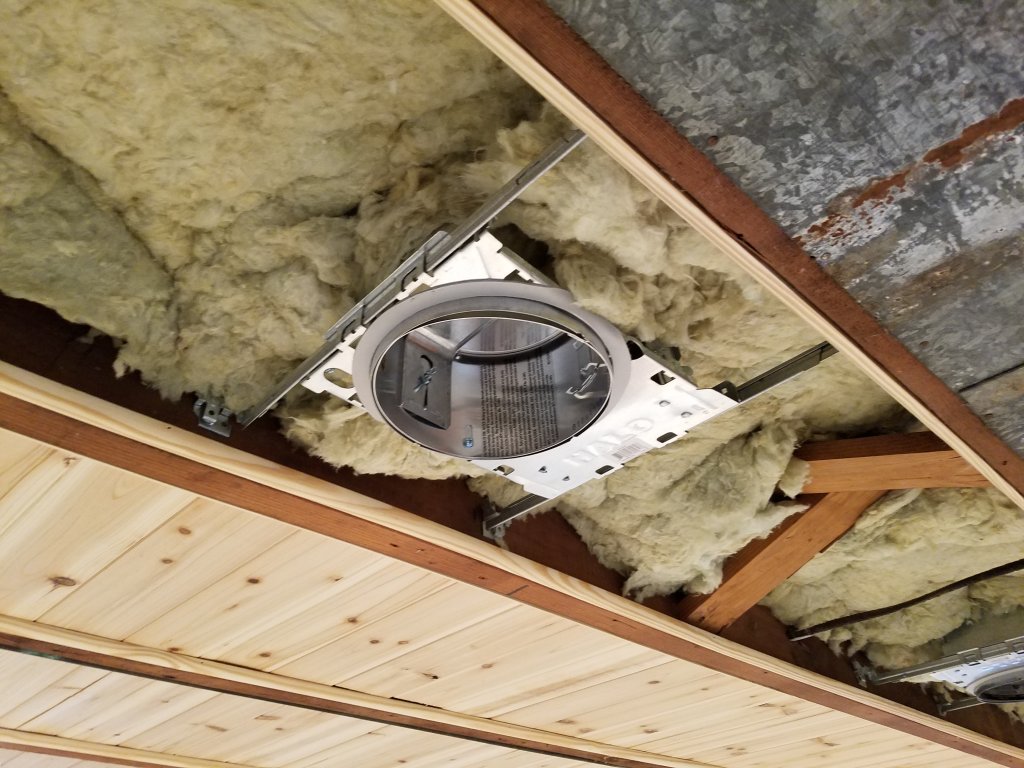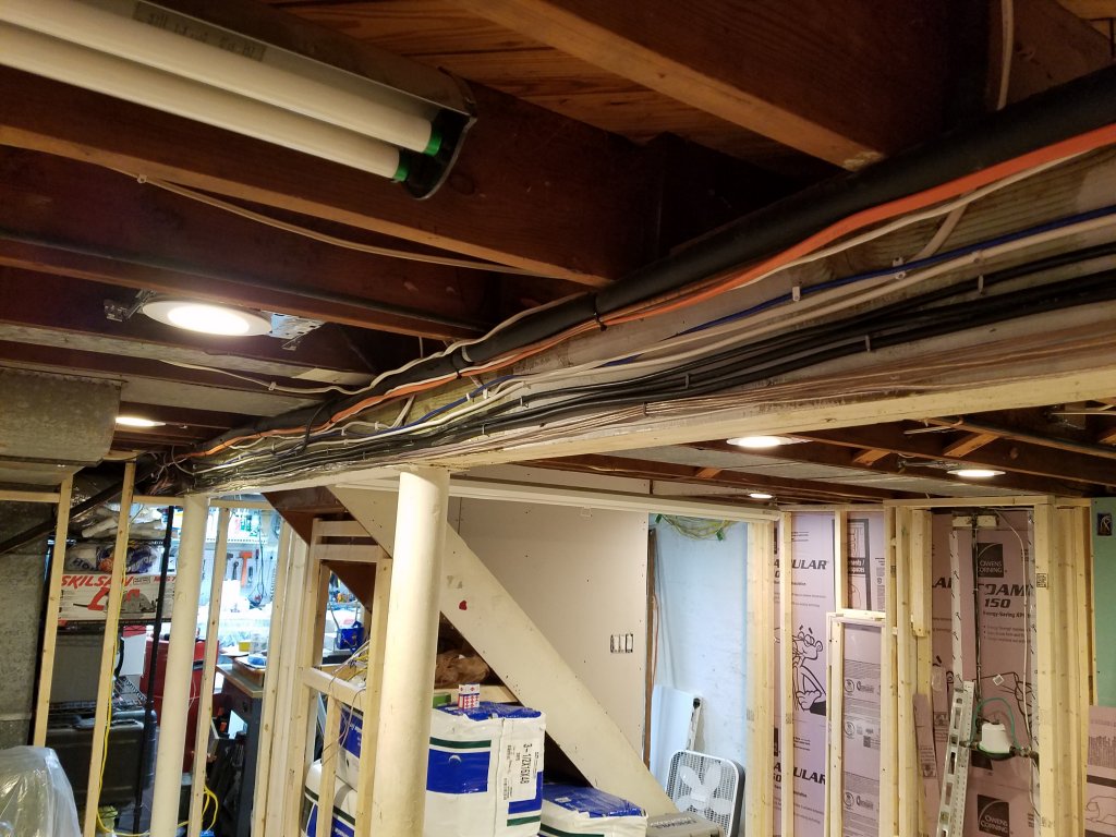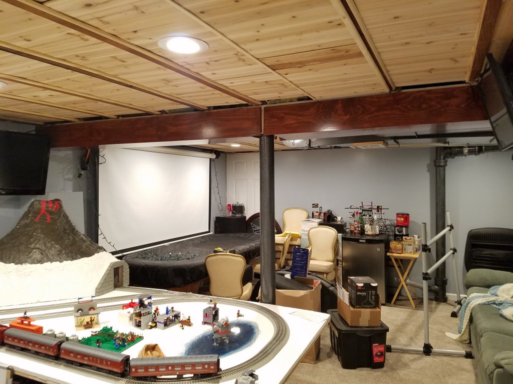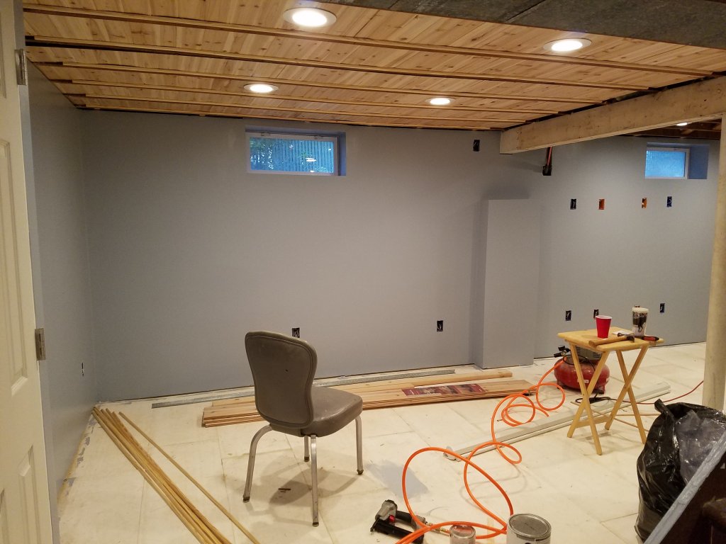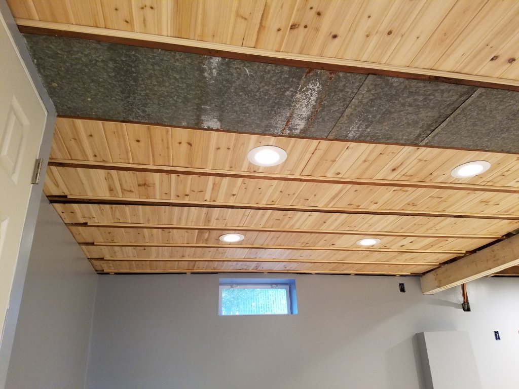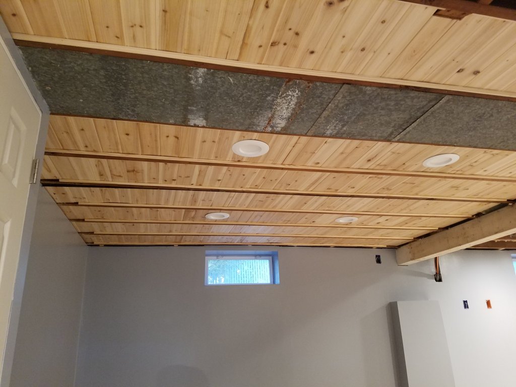 Then on Sunday, with the shop now mostly cleaned up, I started on the cedar plank ceiling. This was probably the one element of the room I've been the most nervous about, it's kind of a "new to me" idea in that I've never seen a picture of anyone doing this in a basement, and while the mock up area looked nice, I was still nervous about how it would look in the end. A better description of the idea is the in OP, but basically the idea was to tack small quarter round molding pieces to the bottoms of the floor joints to support floating cedar planks between the joints, effectively creating a ceiling that would: