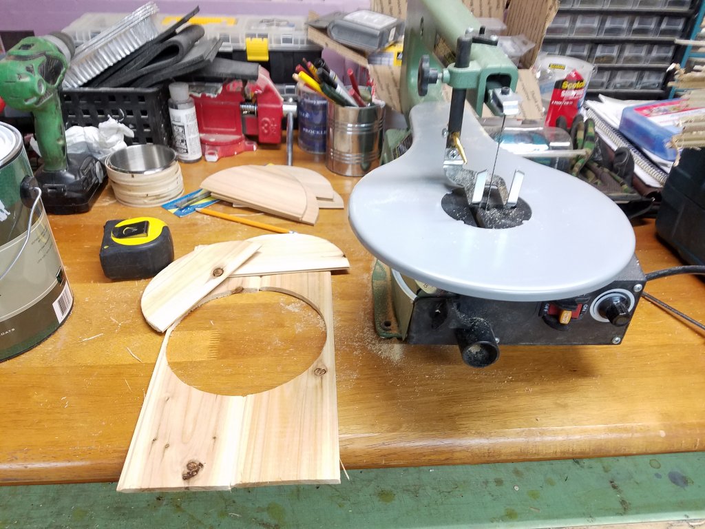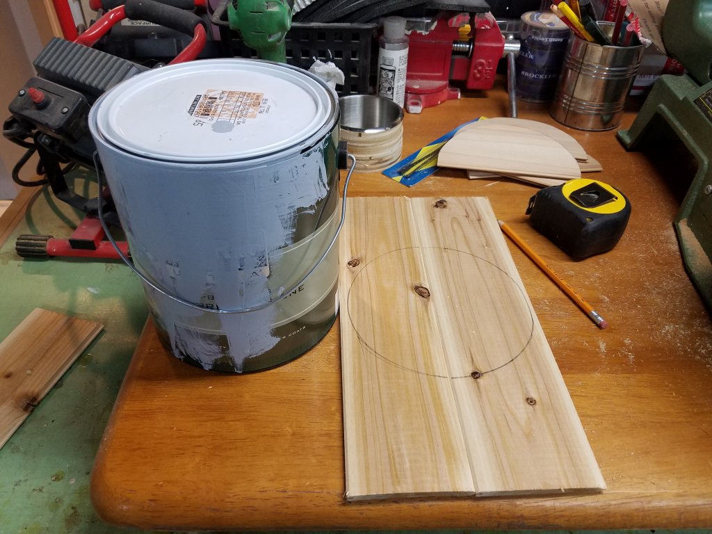 The panels are nice and thin at 1/4", which made cutting around the can lights easy. The bottom of my paint can ended up being the perfect template to trace the cut :) I used my scroll saw for the circular cuts.