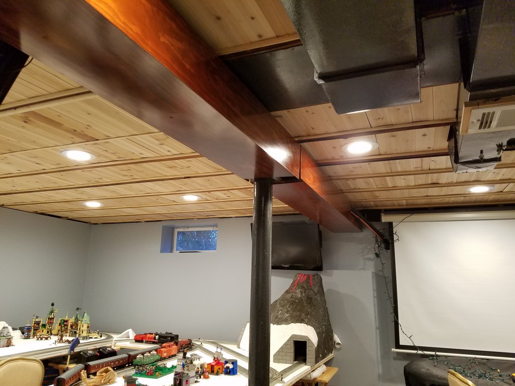 Neither, just leaving it as is with the two tone look. The color of the beam covers is pretty close to the color of the existing floorbeams, so in person it kind of looks like a big grid, almost gives the perception of more depth. The bar will be the same darker color. I thought about staining the planks to match, but the thought of staining and finishing all that area made me cringe, and I find that the lighter color helps to brighten the room. Since the ceilings are pretty low, I felt the darker color on the ceiling would make it look more cave like.