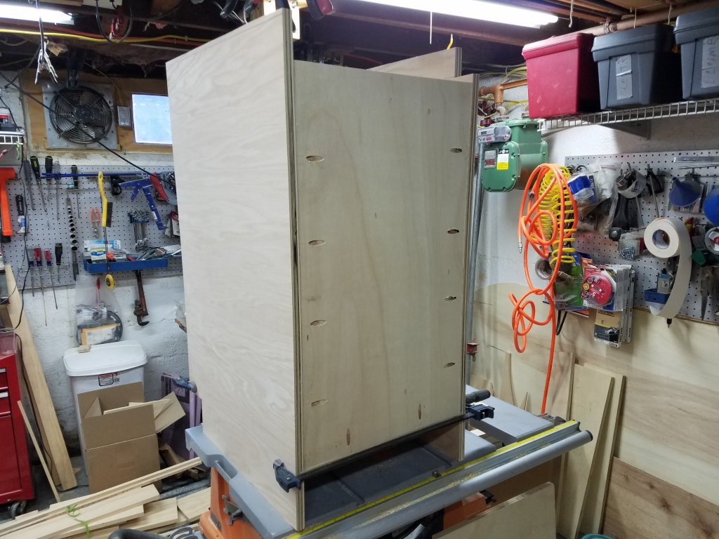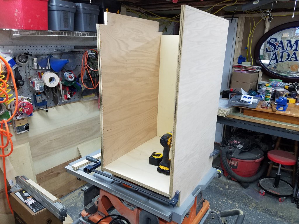 For the base and overhead cabinets, I'm using a pretty simple pocket screw & dado/rabbet approach; while I do enjoy woodworking as a hobby, I'm not experienced to the point where I'm comfortable with the more advanced cabinet making techniques (and I don't have all the tools). The design I'm working with should just fit (vertically) in the space I have, it'll be really tight in a couple of spots. This area has the lowest clearance in my basement as it's furthest from the floor drain (highest floor spots). To make sure everything fits correctly, I'm building everything from the ground up - so I started with the base cabinets. I'm using cabinet grade plywood (oak veneered for the exposed sheets) and facing the frames with solid oak.