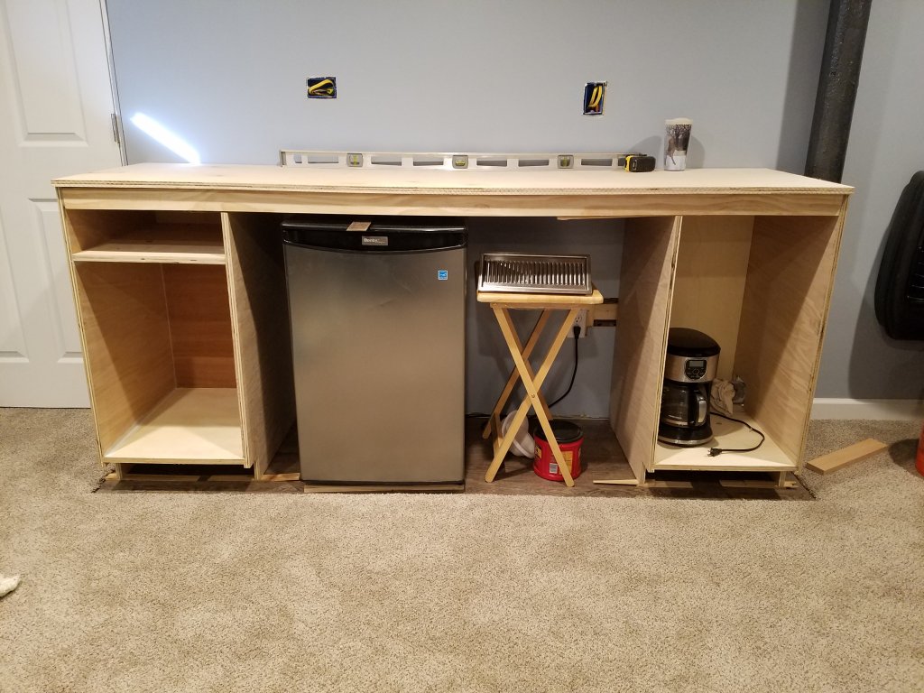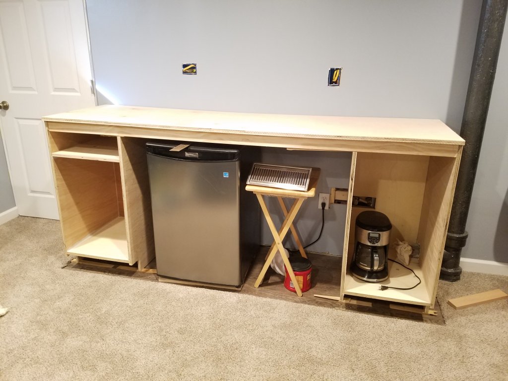 I took a bit of break after new year's to catch up on other work, but have been finishing up the plans for the bar and finally actually got started. I'm probably waaaaay over engineering this, but considering how much stuff I'm attempting to incorporate into the bar, it needed to be sketched up pretty accurately. It's also my first shot doing any type of cabinet work, so I wanted to make sure I had all my dimensions and clearance correct. Here's the updated sketch (just the base cabinet pieces, face frames & doors not show for clarity):