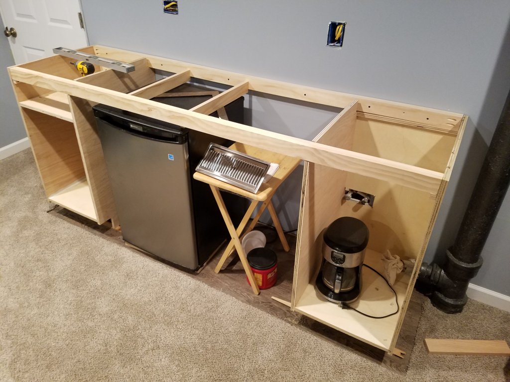 Dry run for all the base cabinet fit ups. There are cabinets at both ends, with the framing for the counter top between them.