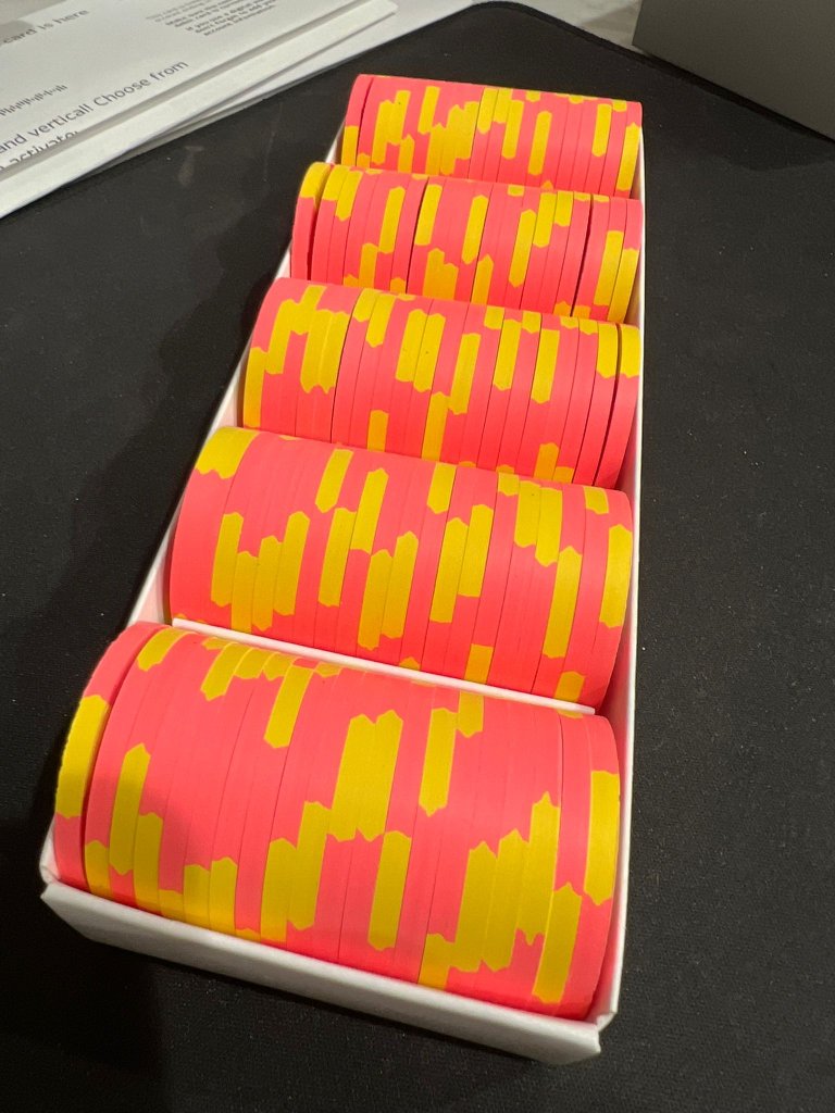 Picked up a little T5 tourney set. Can’t really beat it for the price. First impressions are that you can definitely feel the weight of these chips at 13g. That being said, they stack like actual bricks and have nice square edges so overall pretty happy with this purchase.