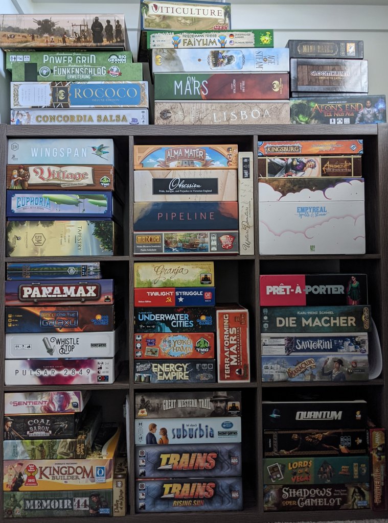 I'm lucky to enough to game twice a week with two different gaming groups (some overlap). One group is the same four people every week and we mainly play coops. Favorites have been the Pandemic Legacies, Aeon's End series, Mechs vs Minions, Marvel Champions. We are currently working through Aeon's End: The New Age. In the other group, we play mid to heavier weight Euros. Power Grid, Rococo, Pipeline, Age of Steam, Lisboa, On Mars.