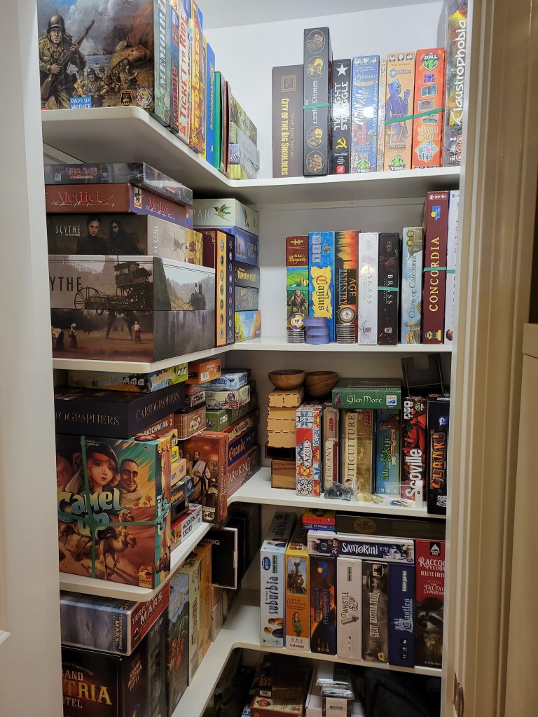 The current situation. I generally go through a cull each year to try to get myself to buy a few less games and it's generally been working. My general rule is that it I haven't played it in two years, it generally goes into the give away pile.