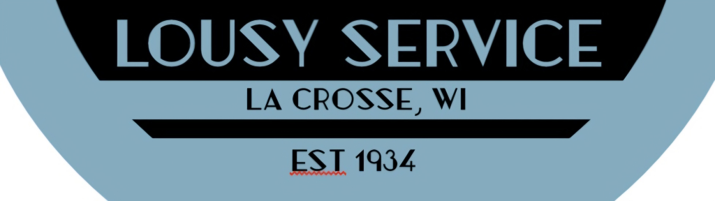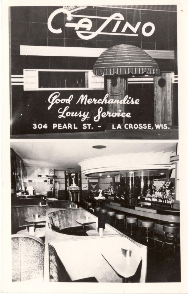 We used to visit the Casino Lounge in La Crosse, Wisconsin back in our college years - it's been ages since we've visited. ...It was kind of a laid back "Art Deco dive bar", right in the heart of the "Pub Crawl" street area, with a pretty cool neon sign out front. They always pushed the "Lousy Service", and it's prominent on that old neon sign.