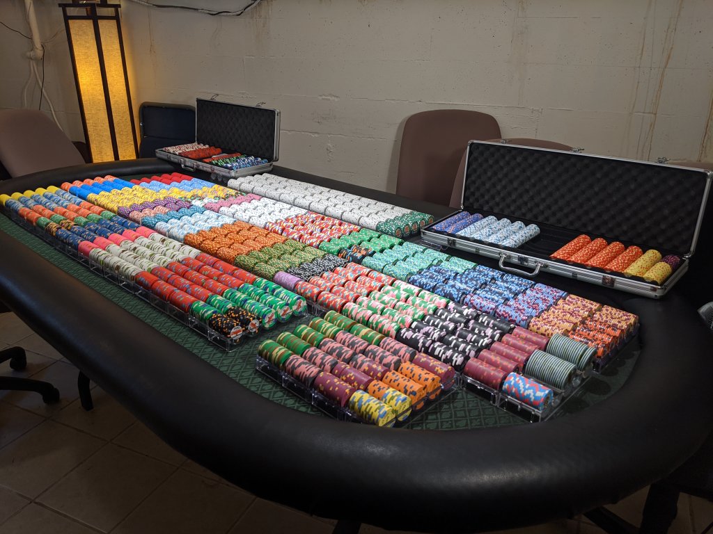 Even though this is just a cell phone photo, the background (filthy basement wall, chairs haphazardly placed, ugly cables and pipes) takes away from the majesty of all the chips in the middle.