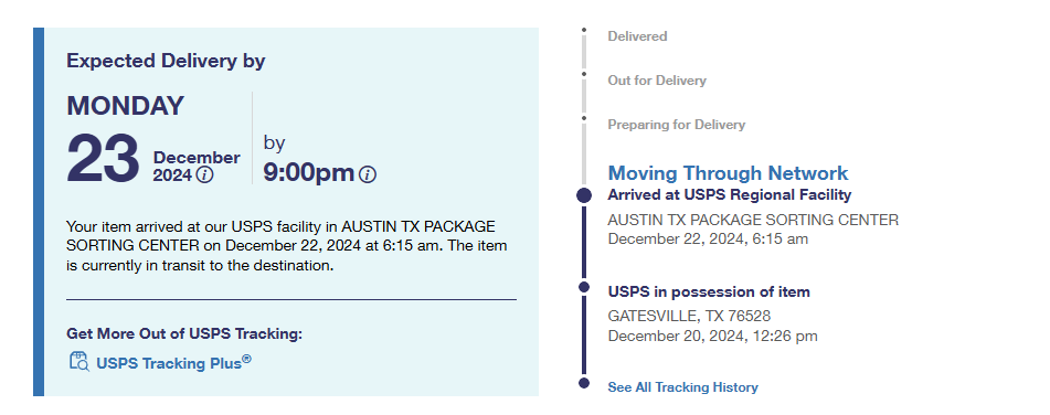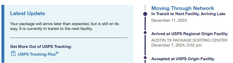 I love how the package shows as in Austin, yet they can't move it the last few miles to me. Yay USPS!