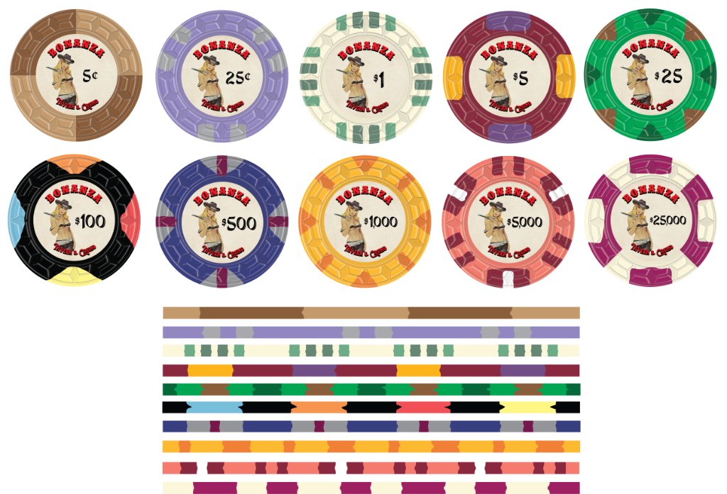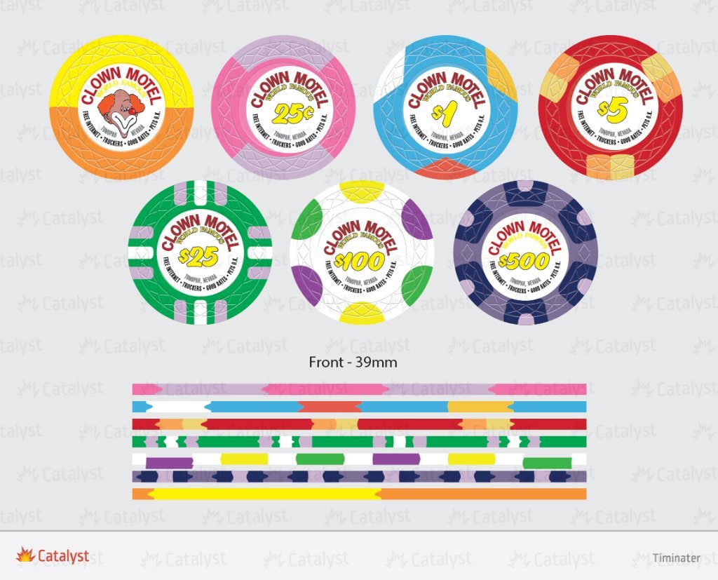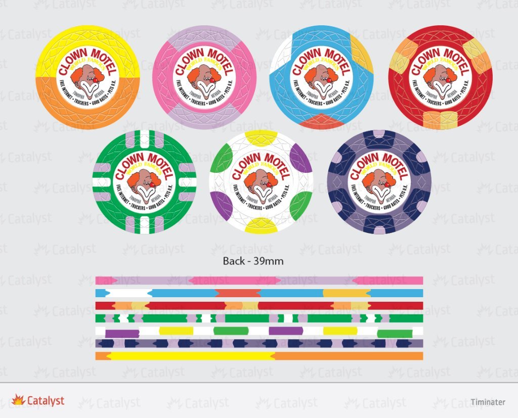 These have labels of your designs affixed during manufacturing. These chips will require a label printing fee of approx. $80 per order. This will be determined prior to invoice. Factors include the number of denominations in your set as well as the total number of different custom sets per order. I will need one .ai for the chip and one for the label. Both sides of chips will require the same label. If multiple people use the same art then the label fee will be split accordingly