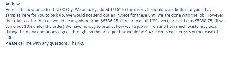 I would expect that if you order 12,050 boxes, you get 12,050 boxes and pay for 12,050 boxes. What's this about giving us 12,500 pricing with the caveat that we order 12,500 boxes. Is that supposed to be a deal? Because it's the same as it was before.