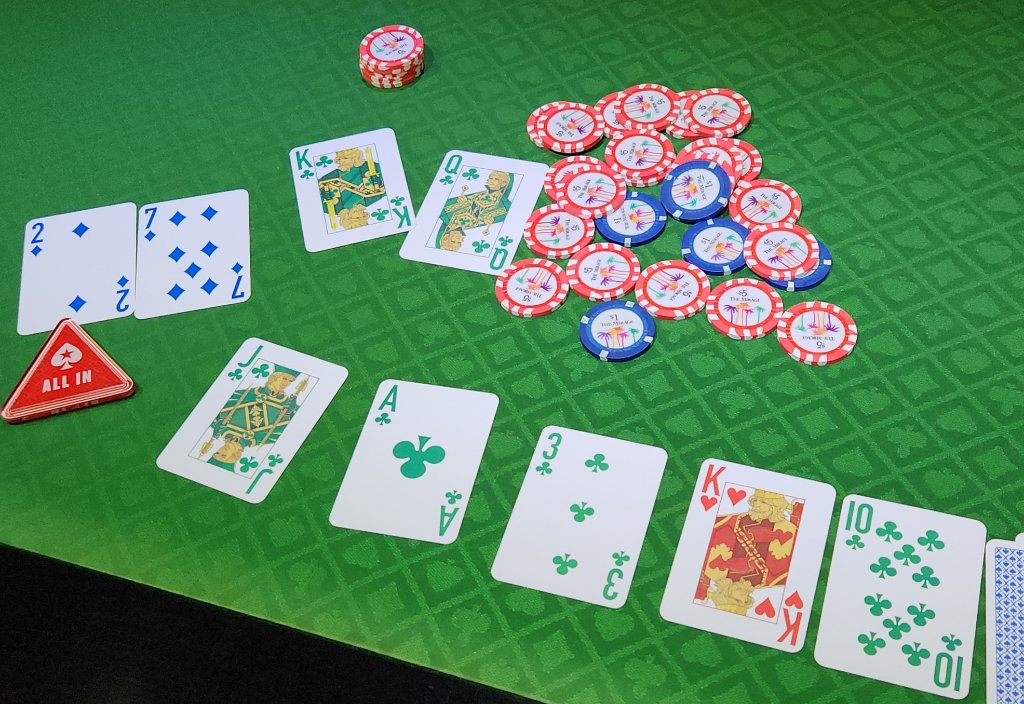 How's this for bad timing? @Monaco trying to get a 7-2 thru @sethwanab's flopped Flush draw/Top Pair. (Yes I deal left handed people so the Board goes right to left) Monaco kept bluffing and eventually lost his stack to a Nut Flush that improved to a Royal! As a person who loves to play 7-2 even during a tournament this was just BRUTAL to watch.