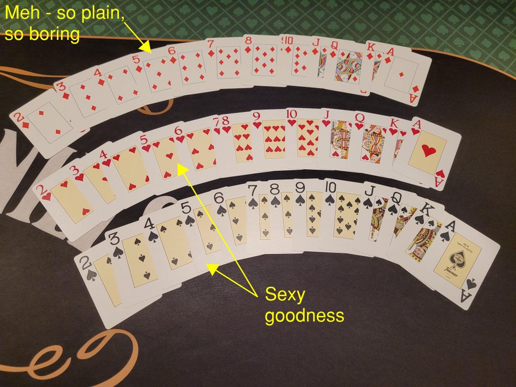 As far as the yellow boxes on the card faces go, my controversial opinion is that the only things that matter about cards are the stock and the pips. The backs? Couldn’t give a crap! The faces? I only look at the pips.