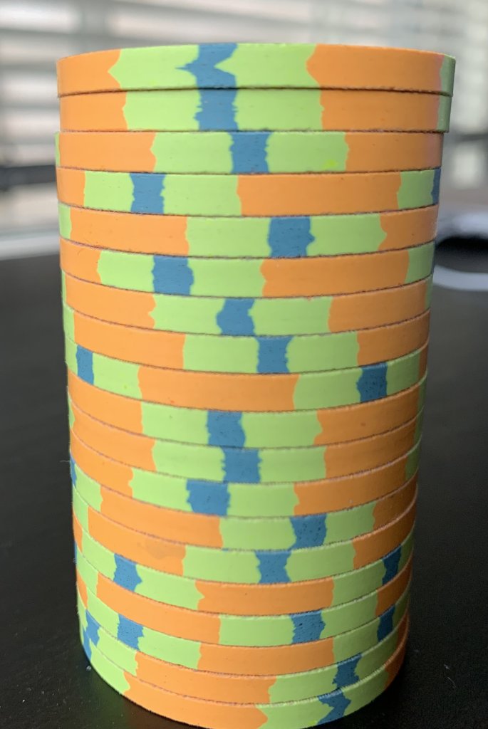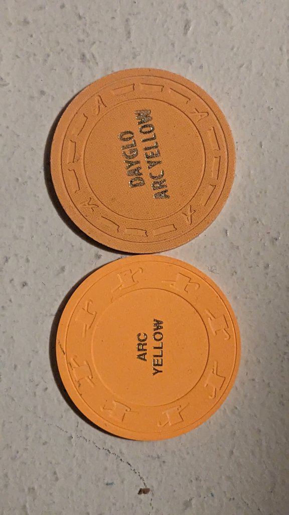 Said it before, I'll say it again. Dg Saturn and dg orange are both translucent. Meaning, if you hold them up to light, it passes through the shallow edges. Because of this the color seems to be not uniform and against bright colors will allow some "tinting" of the outer edge. They are best used for 1/8" spots to minimize this effect. Both colors are hideous and unless it is exactly the color you're looking for, should be avoided.