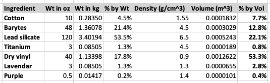 The ingredients by volume are more informative than the ingredients by weight, though both are useful. You can calculate the volume using the formula Vsg=m/(SG∗998.2) where Vsg is the volume from specific gravity (m^3), m is the mass in kg, and SG is the specific gravity or density (g/cm^3).