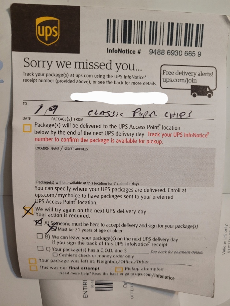I can hear that conversation..."WTF are Classic Pork Chips?? They are heavy!" LMFAOLol, just as "special" as mine - they left this on the door last year for my cash set while I was on a business trip, made my wife chuckle she was like WTF did you order?!?!?!?