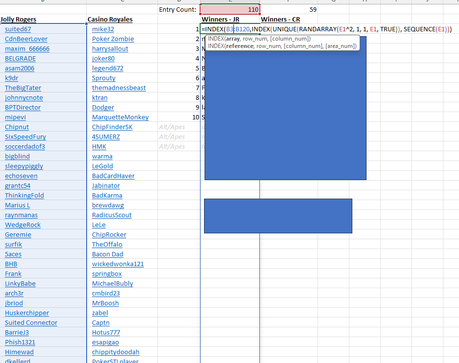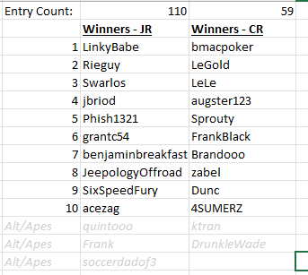 I think you made a mistake, I don't see my name in the winners column...Surprise pull-ahead. Below are the winners from a randarray excel drawing. No funny business, just pasted in all the latest names and refreshed formulas.