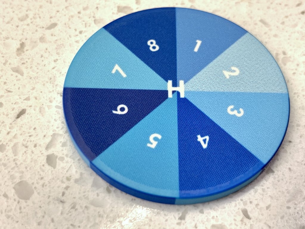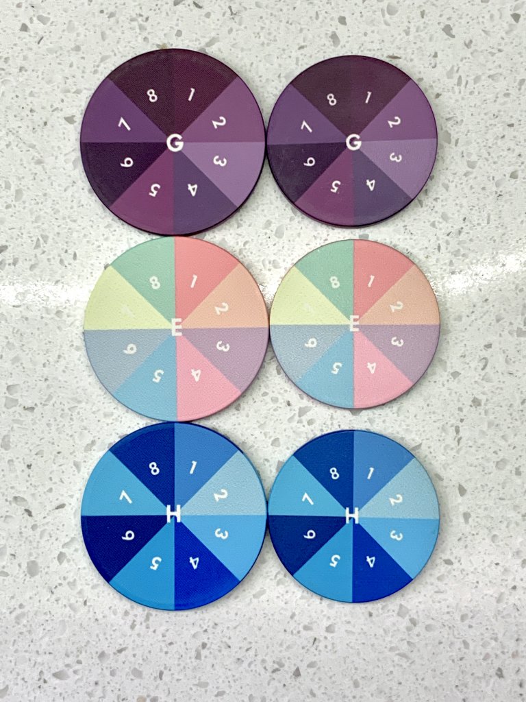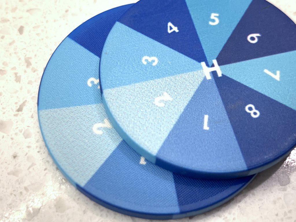 Below you can see the print “spotting” on the light blue #2 color of the smooth surface no mold chip on top of the textured chip on the bottom. To my eye it actually looks like faux texturing when I am trying to look for it. It appears to still occur on the textured chip, but the texturing hides it. On all of the coloring sample chips this is really the only example of this that I could find. And none of your players would really notice this. It doesn’t bother me at all but this is what Tina is referring to I believe.