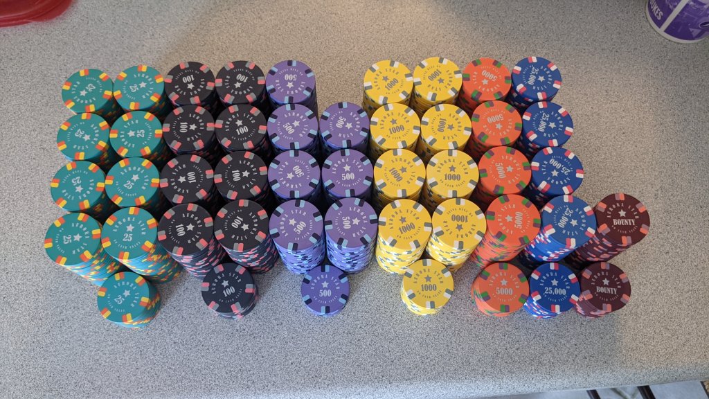 Rethinking i'd have probably ordered less $20 chips and more $5000 and even a possible $25k or 10k chips or even plaques. I would recommend at least 1 and up to 5 as a minimum, especially if ordering customs you can not replace easily.