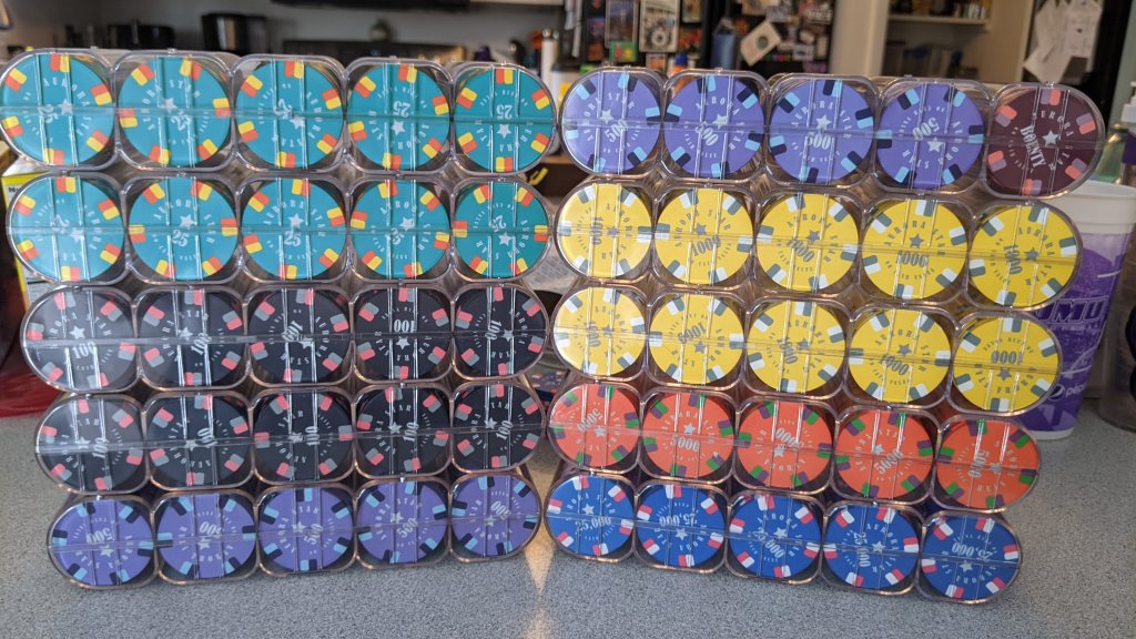 I ordered 3 extra of everything for my CPC set.... as for cards mold they are cheap enough ordered the breakdown I wanted them filled out each denom to the next largest rack/25chip volume to fill out the shipping MFRB weight volume. I think each MFRB was around 800ish chips and 4 was 3575 chips so I ordered 4 MFRB's of chips......I'd have ordered 3600 but that would have pushed me over to 5 MFRB's and higher shipping costs....I couldn't justify over 4000 chips so 3575 was it.