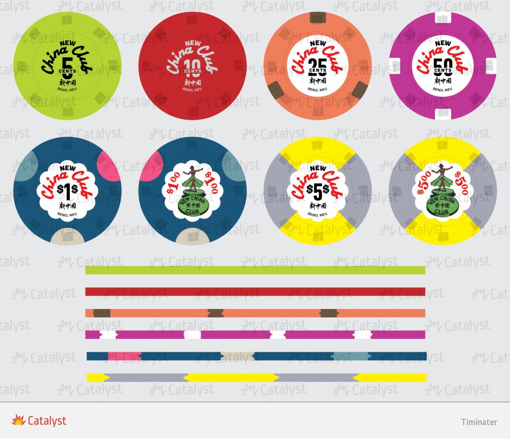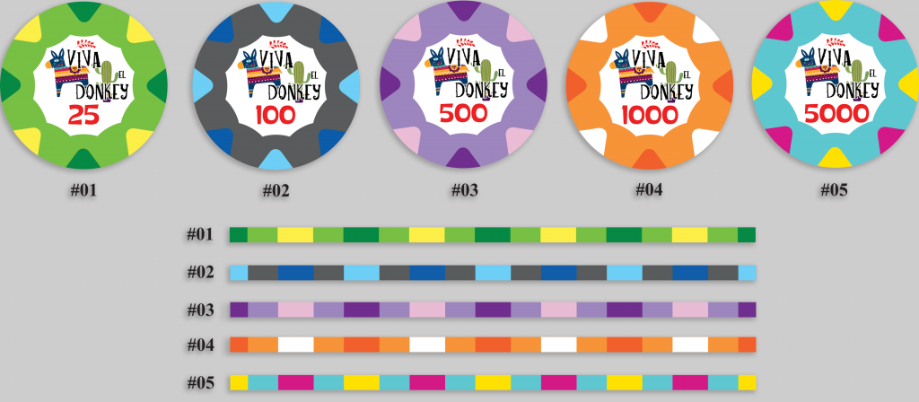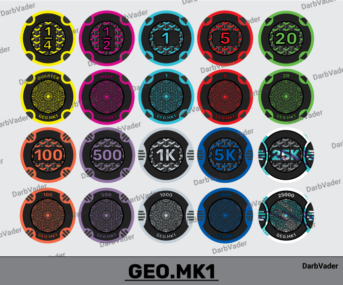 These are designed for the 39mm card mold and I'm hoping to get the color as bright as possible within the bounds of CMYK printing (technically won't allow for fluorescent colors without special ink mixes). Legibility was a concern but I've printed some 1:1 scale versions and haven't had any issues. These will be used for board games (18xx, etc.) most often and some poker on the side. The 25k chip started out as a gag but it really grew on me so we'll see if it'll make it to production.