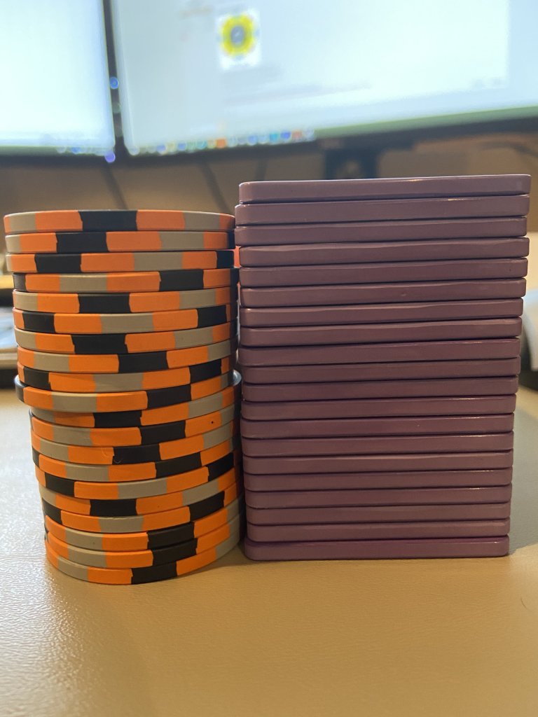 Thanks @Himewad the visual helps! Looks good. Would love to add some plaques if others are in.That looks like it’s exactly the same thickness as my tournament plaques I had made by BR Pro Poker. Here are stacks of 20 Royals and 20 plaques. They are solid ... don’t feel thin at all.