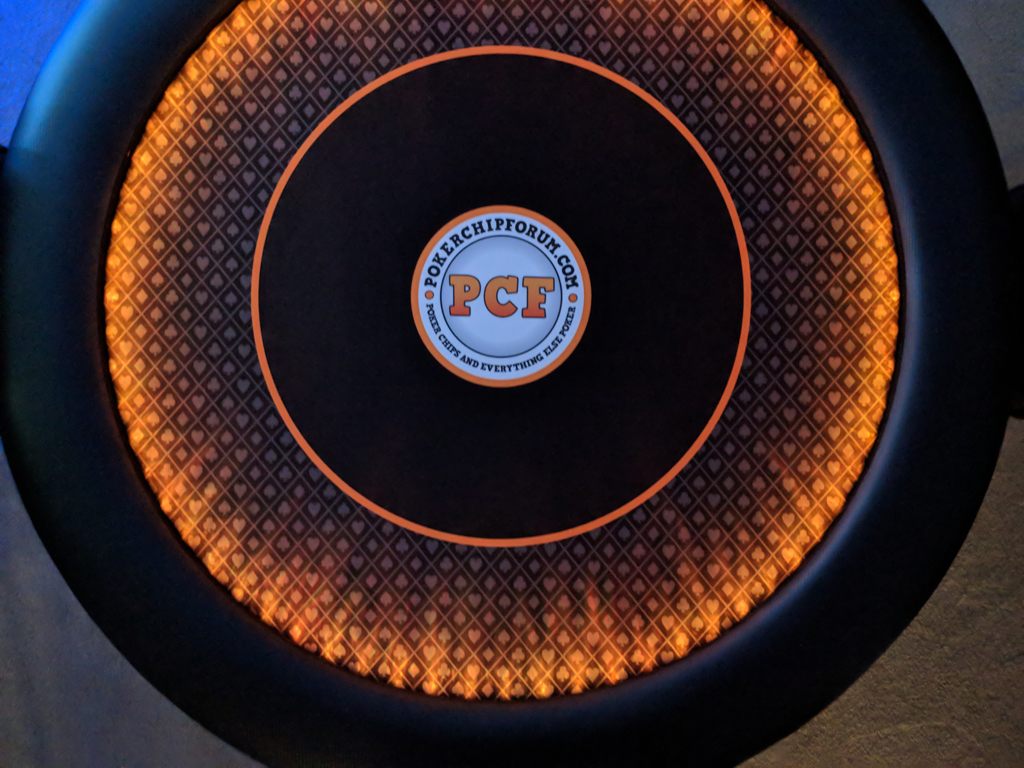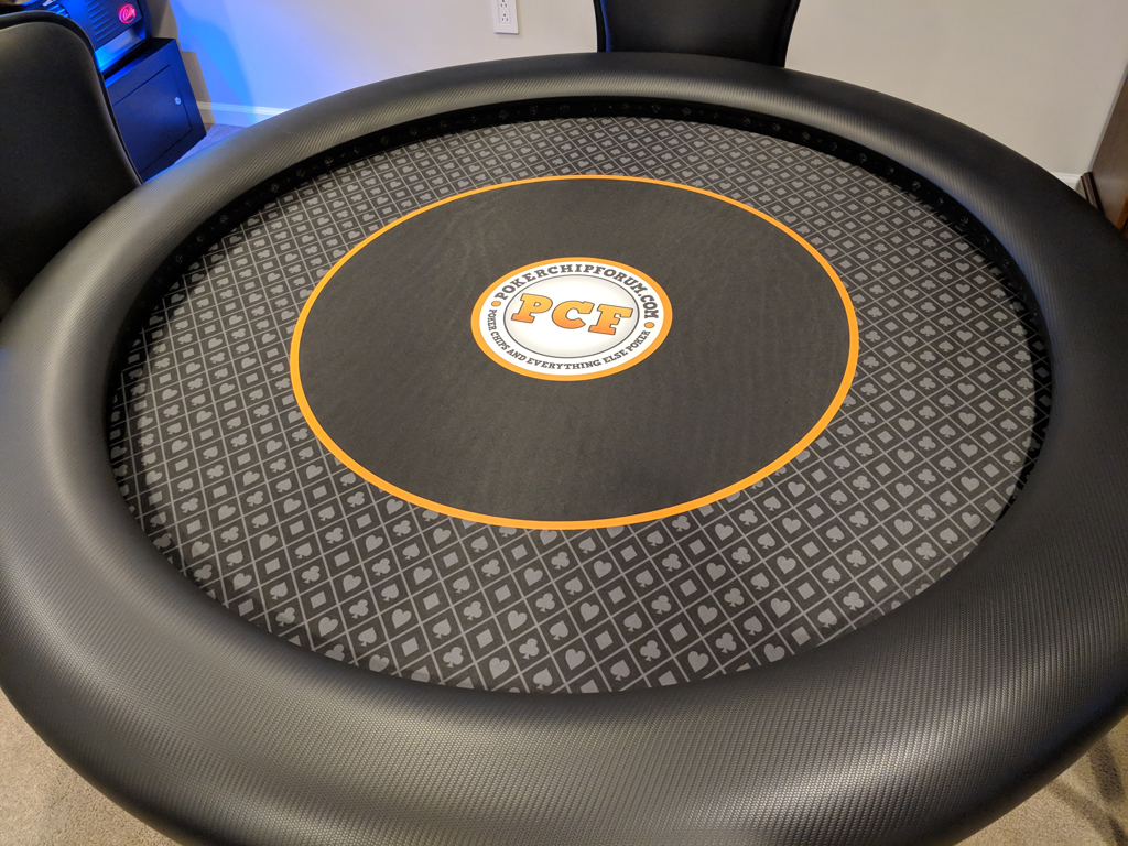The table itself, one with folding legs, had the felt and foam appllied by a caprenter friend of mine, who also collared it with an oversized rail to extend its diameter from 120 to 128cm (47.5 to 50.5 in) and make it capable of accommodating 7 players. Really nice work, especially if you take into account that this was the first poker table that he saw, let alone built, in his life.:)