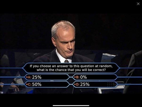 Nice. I occasionally like to do something similar at the poker table. When heads up and I place a big big and I see that the villain is obviously doing some math in their head, I'll politely say "Let me help you out there - it's 50/50. You either have the better hand or your don't, so you're chances are 50%". It's fun mess'n with people lol