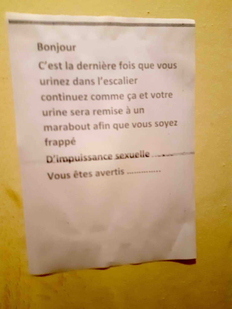 It says: This is the last time you urinate on the stairs keep it up and your urine will be given to a marabout so that you will be struck with sexual impotence. You have been warned.