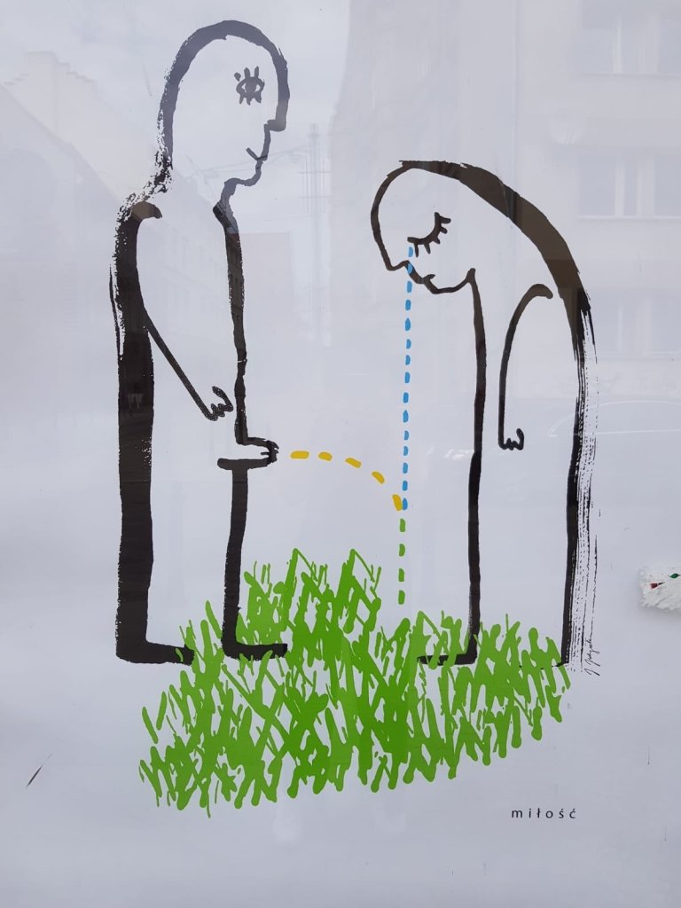 The word on the bottom is Polish for “love.”Tears (blue) and urine (yellow) make green?