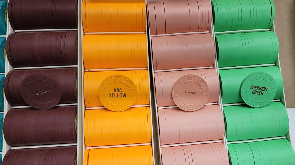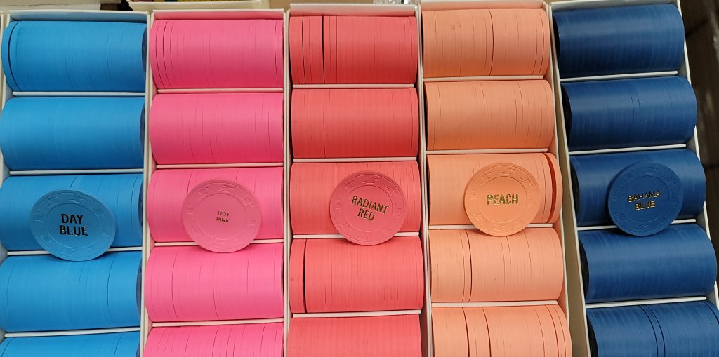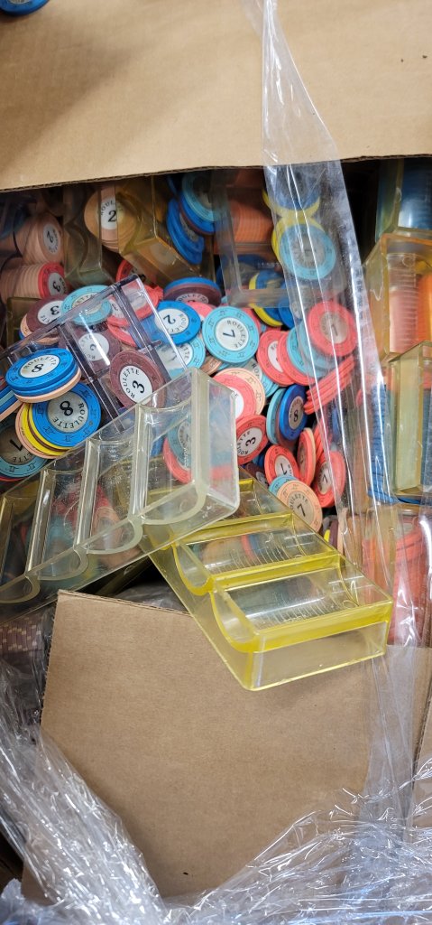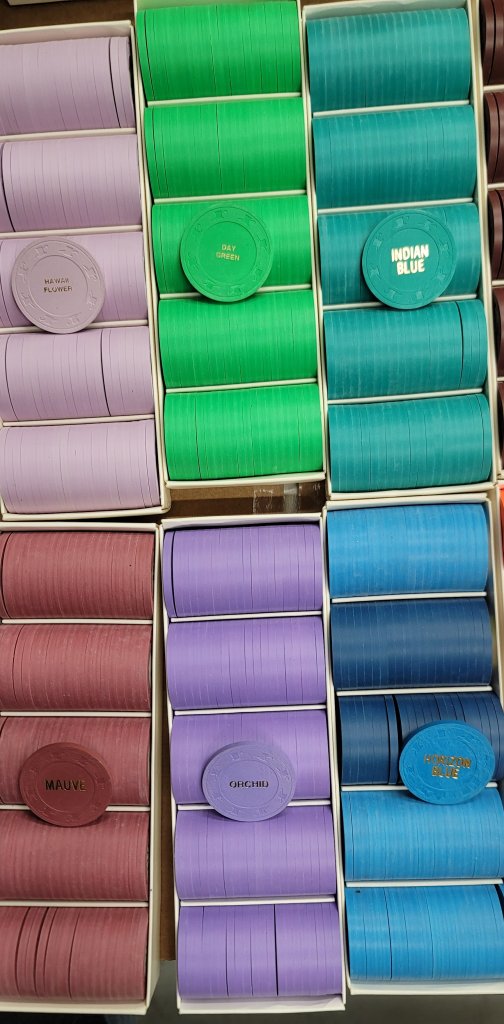 Still going through all of the boxes. We can only purchase secondary and NCV chips in Louisiana. Although all of boxes shifted during transportation back to Utah, all of the chips survived. The secondary chips were in the white boxes and taped shut. Some of the NCV chips were in boxes, others in racks. There are roulette (Bud Jones and Paulson), a couple different tournament sets and promotional chips. The Paulson roulette and tournament seem to all be THC mold chips. The promo chips are 43mm IHC hot stamped solids. Here are some pictures. More to come.
