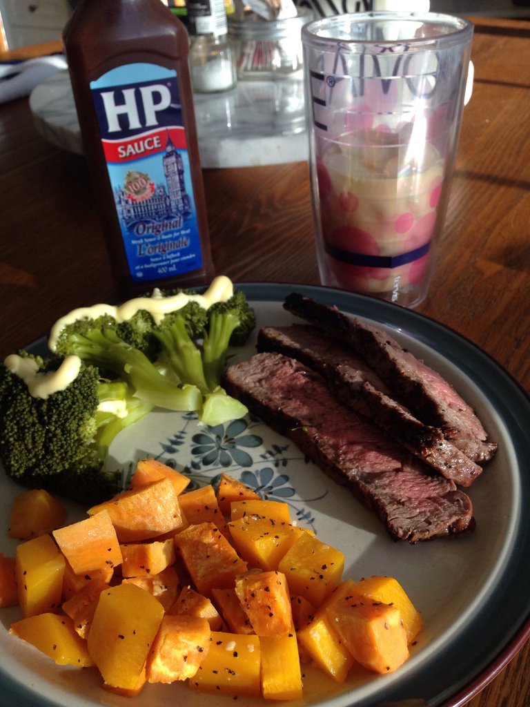 Lol Gear gave me a bottle of HP sauce as well.London broil, butternut squash, and broccoli with HP sauce on the side - thanks @Gear