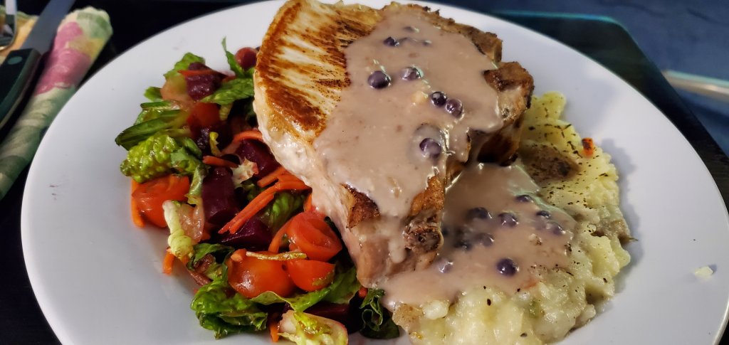 PZ made Pork Chops last night with a ginger-blue-berry demi glaze, served on top of mashed potatoes (the red/green color you see are jalepenos) and a salad. What a great way to say good bye to 2020!View attachment 605716