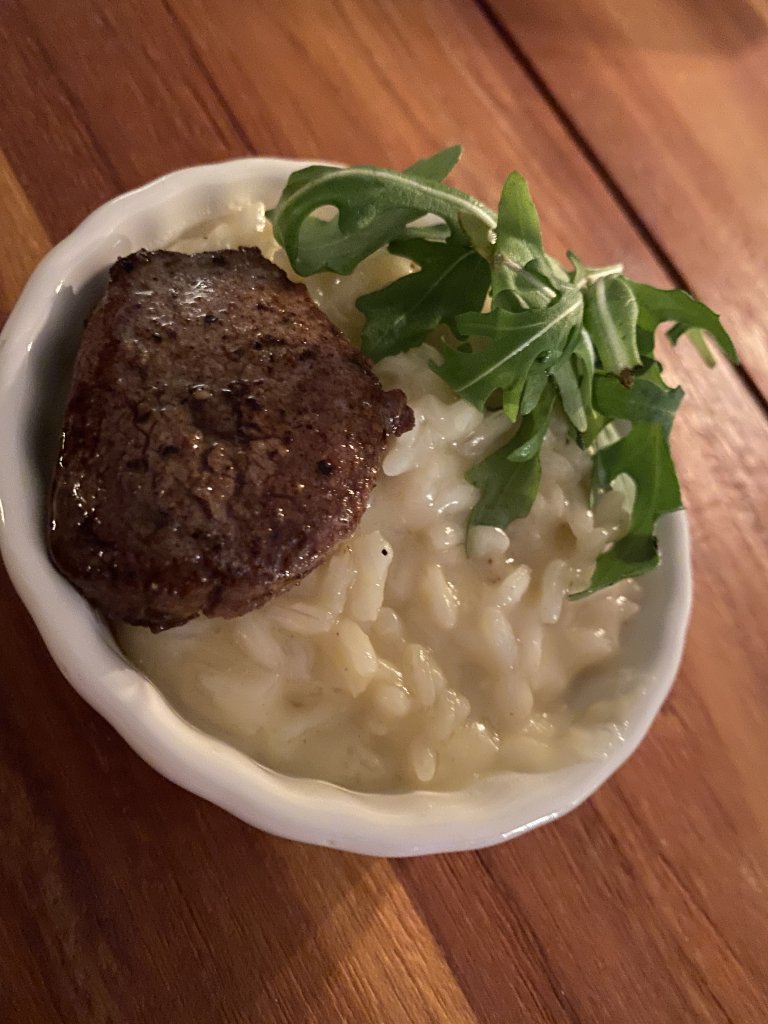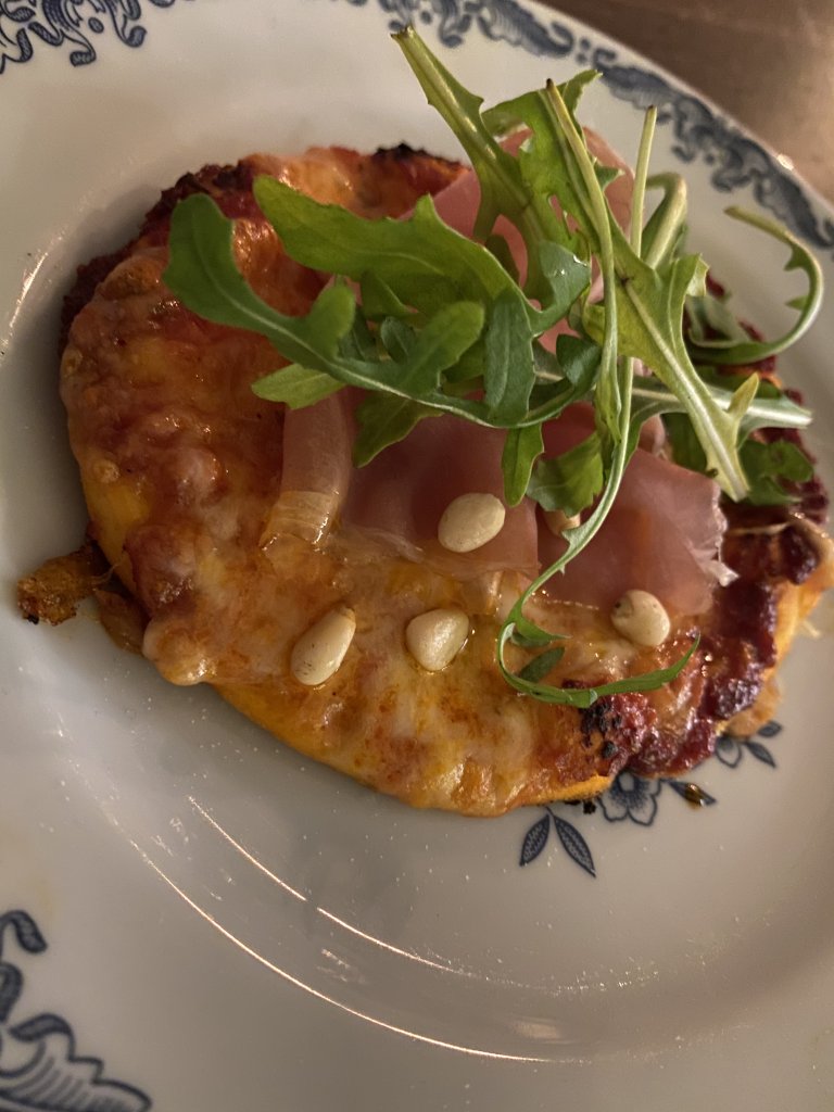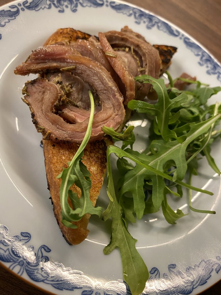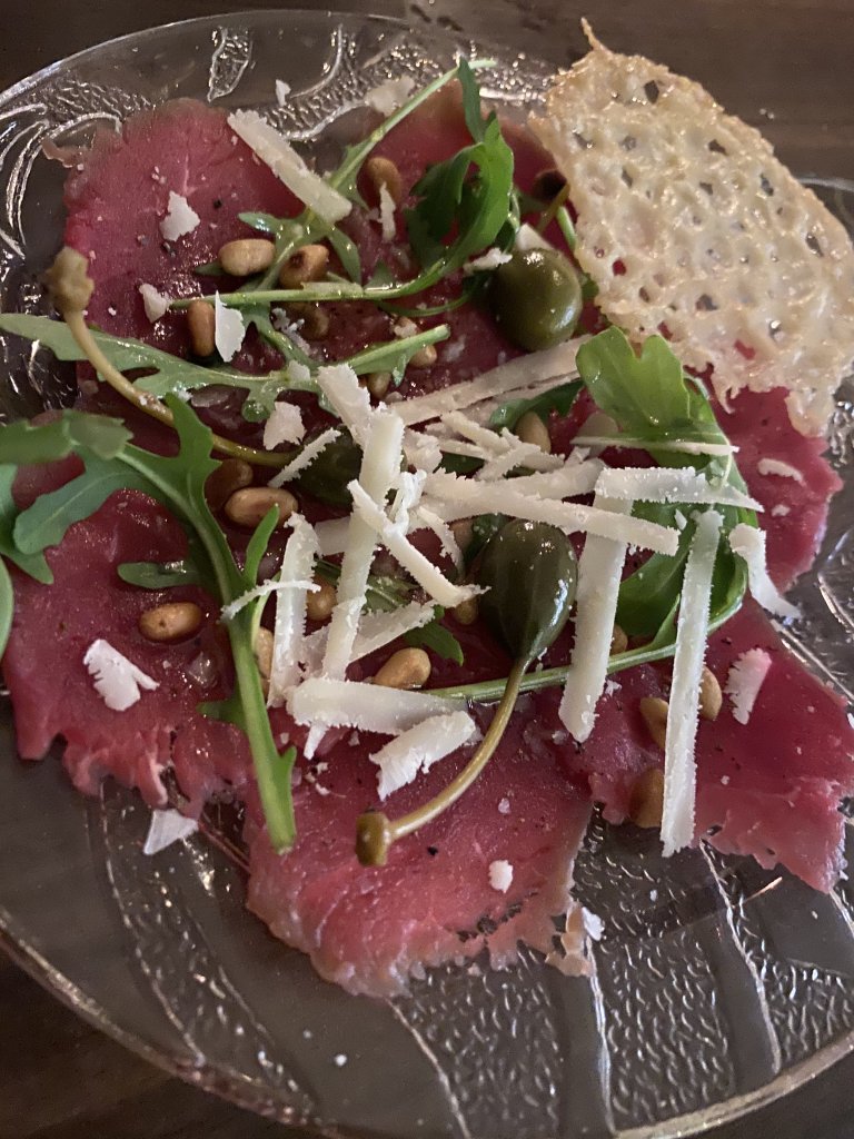 3: carpaccio from deer with caper, roasted pine nuts, ruccola and parmesan chips